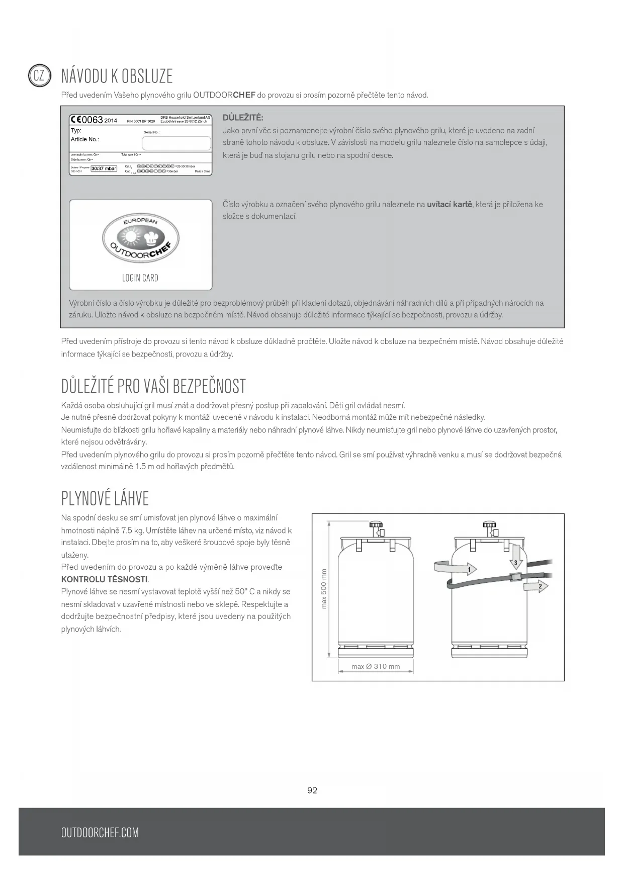 NávODU K OBSLUzE Před uvedením Vašeho plynového grilu OUTDOORCHEF do provozu si prosím pozorně přečtěte tento návod. Před uvedením přístroje do provozu si tento návod k obsluze důkladně pročtěte. Uložte návod k obsluze na bezpečném místě. Návod obsahuje důležité informace týkající se bezpečnosti, provozu a údržby. DŮLEŽITÉ PRO vAŠI BEzPEČNOST Každá osoba obsluhující gril musí znát a dodržovat přesný postup při zapalování. Děti gril ovládat nesmí. Je nutné přesně dodržovat pokyny k montáži uvedené v návodu k instalaci. Neodborná montáž může mít nebezpečné následky. Neumisťujte do blízkosti grilu hořlavé kapaliny a materiály nebo náhradní plynové láhve. Nikdy neumisťujte gril nebo plynové láhve do uzavřených prostor, které nejsou odvětrávány. Před uvedením plynového grilu do provozu si prosím pozorně přečtěte tento návod. Gril se smí používat výhradně venku a musí se dodržovat bezpečná vzdálenost minimálně 1.5 m od hořlavých předmětů. PLyNOvÉ LáHvE Na spodní desku se smí umisťovat jen plynové láhve o maximální hmotnosti náplně 7.5 kg. Umístěte láhev na určené místo, viz návod k instalaci. Dbejte prosím na to, aby veškeré šroubové spoje byly těsně utaženy. Před uvedením do provozu a po každé výměně láhve proveďte KONTROLU TĚSNOSTI. Plynové láhve se nesmí vystavovat teplotě vyšší než 50° C a nikdy se nesmí skladovat v uzavřené místnosti nebo ve sklepě. Respektujte a dodržujte bezpečnostní předpisy, které jsou uvedeny na použitých plynových láhvích. max 500 mm max Ø 310 mm