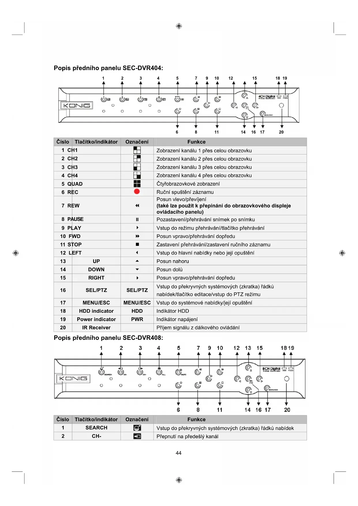 - Podpora operačních systémů Symbian, Windows Mobile, iPhone, Blackberry & Android Poznámky: - Standardně je obrazovkový displej nastaven na výstupní kanál VGA. Ke změně tohoto nastavení v nabídce se prosím podívejte do kompletního anglického manuálu Section 4.11 Main Menu Setup (část 4.11 Nastavení hlavní nabídky). - Jestliže není obrazovkový displej k dispozici, stiskněte na dálkovém ovládání na 5 sekund tlačítko „0“ nebo tlačítko „<<“ na předním panelu rovněž na 5 sekund. Jako potvrzení zazní zvuk pípnutí. Tento postup může být také použit k ručnímu přepnutí mezi výstupem VGA nebo BNC.44 Popis předního panelu SEC-DVR404: Číslo Tlačítko/indikátor Označení Funkce 1 CH1 Zobrazení kanálu 1 přes celou obrazovku 2 CH2 Zobrazení kanálu 2 přes celou obrazovku 3 CH3 Zobrazení kanálu 3 přes celou obrazovku 4 CH4 Zobrazení kanálu 4 přes celou obrazovku 5 QUAD Čtyřobrazovkové zobrazení 6 REC Ruční spuštění záznamu 7 REW