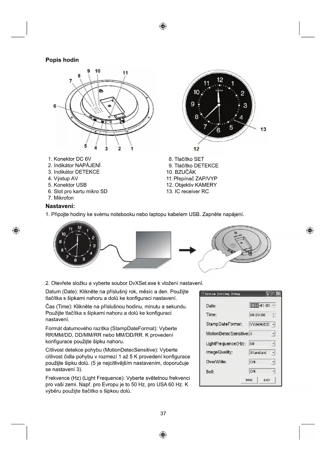 Poznamka: camera je osazena uvnit hodin s uhlem sklonu 17 stupn. Zorny uhel objektivu je 45 stupn.