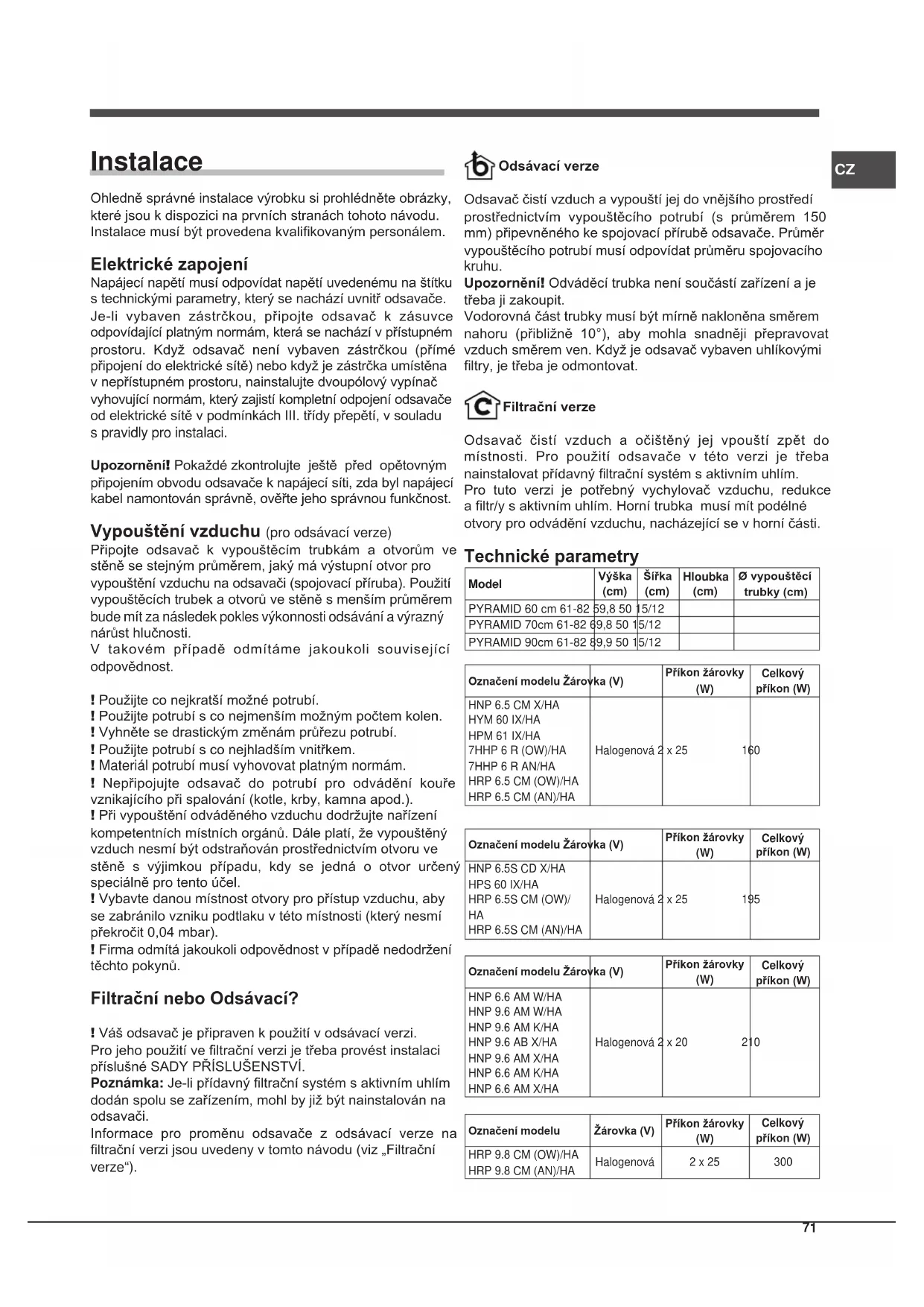 Instalace Ohledně správné instalace výrobku si prohlédněte obrázky, které jsou k dispozici na prvních stranách tohoto návodu. Instalace musí být provedena kvalikovaným personálem. Elektrické zapojení Napájecí napětí musí odpovídat napětí uvedenému na štítku s technickými parametry, který se nachází uvnitř odsavače. Je-li vybaven zástrčkou, připojte odsavač k zásuvce odpovídající platným normám, která se nachází v přístupném prostoru. Když odsavač není vybaven zástrčkou (přímé připojení do elektrické sítě) nebo když je zástrčka umístěna v nepřístupném prostoru, nainstalujte dvoupólový vypínač vyhovující normám, který zajistí kompletní odpojení odsavače od elektrické sítě v podmínkách III. třídy přepětí, v souladu s pravidly pro instalaci. Upozornění! Pokaždé zkontrolujte ještě před opětovným připojením obvodu odsavače k napájecí síti, zda byl napájecí kabel namontován správně, ověřte jeho správnou funkčnost. Vypouštění vzduchu (pro odsávací verze) Připojte odsavač k vypouštěcím trubkám a otvorům ve stěně se stejným průměrem, jaký má výstupní otvor pro vypouštění vzduchu na odsavači (spojovací příruba). Použití vypouštěcích trubek a otvorů ve stěně s menším průměrem bude mít za následek pokles výkonnosti odsávání a výrazný nárůst hlučnosti. V takovém případě odmítáme jakoukoli související odpovědnost. ! Použijte co nejkratší možné potrubí. ! Použijte potrubí s co nejmenším možným počtem kolen. ! Vyhněte se drastickým změnám průřezu potrubí. ! Použijte potrubí s co nejhladším vnitřkem. ! Materiál potrubí musí vyhovovat platným normám. ! Nepřipojujte odsavač do potrubí pro odvádění kouře vznikajícího při spalování (kotle, krby, kamna apod.). ! Při vypouštění odváděného vzduchu dodržujte nařízení kompetentních místních orgánů. Dále platí, že vypouštěný vzduch nesmí být odstraňován prostřednictvím otvoru ve stěně s výjimkou případu, kdy se jedná o otvor určený speciálně pro tento účel. ! Vybavte danou místnost otvory pro přístup vzduchu, aby se zabránilo vzniku podtlaku v této místnosti (který nesmí překročit 0,04 mbar). ! Firma odmítá jakoukoli odpovědnost v případě nedodržení těchto pokynů. Filtrační nebo Odsávací? ! Váš odsavač je připraven k použití v odsávací verzi. Pro jeho použití ve ltrační verzi je třeba provést instalaci příslušné SADY PŘÍSLUŠENSTVÍ. Poznámka: Je-li přídavný ltrační systém s aktivním uhlím dodán spolu se zařízením, mohl by již být nainstalován na odsavači. Informace pro proměnu odsavače z odsávací verze na ltrační verzi jsou uvedeny v tomto návodu (viz „Filtrační verze“). Odsávací verze Odsavač čistí vzduch a vypouští jej do vnějšího prostředí prostřednictvím vypouštěcího potrubí (s průměrem 150 mm) připevněného ke spojovací přírubě odsavače. Průměr vypouštěcího potrubí musí odpovídat průměru spojovacího kruhu. Upozornění! Odváděcí trubka není součástí zařízení a je třeba ji zakoupit. Vodorovná část trubky musí být mírně nakloněna směrem nahoru (přibližně 10°), aby mohla snadněji přepravovat vzduch směrem ven. Když je odsavač vybaven uhlíkovými ltry, je třeba je odmontovat. Filtrační verze Odsavač čistí vzduch a očištěný jej vpouští zpět do místnosti. Pro použití odsavače v této verzi je třeba nainstalovat přídavný ltrační systém s aktivním uhlím. Pro tuto verzi je potřebný vychylovač vzduchu, redukce a ltr/y s aktivním uhlím. Horní trubka musí mít podélné otvory pro odvádění vzduchu, nacházející se v horní části. Technické parametry ModelVýška (cm) Šířka (cm) Hloubka (cm) Ø vypouštěcí trubky (cm)PYRAMID 60 cm 61-82 59,8 50 15/12PYRAMID 70cm 61-82 69,8 50 15/12PYRAMID 90cm 61-82 89,9 50 15/12Označení modelu Žárovka (V)Příkon žárovky (W) Celkový příkon (W)HNP 6.5 CM X/HAHYM 60 IX/HAHPM 61 IX/HA7HHP 6 R (OW)/HA7HHP 6 R AN/HAHRP 6.5 CM (OW)/HAHRP 6.5 CM (AN)/HAHalogenová 2 x 25 160Označení modelu Žárovka (V)Příkon žárovky (W) Celkový příkon (W)HNP 6.5S CD X/HAHPS 60 IX/HAHRP 6.5S CM (OW)/ HRP 6.5S CM (AN)/HAHalogenová 2 x 25 195Označení modelu Žárovka (V)Příkon žárovky (W) Celkový příkon (W)HNP 6.6 AM W/HAHNP 9.6 AM W/HAHNP 9.6 AM K/HAHNP 9.6 AB X/HAHNP 9.6 AM X/HAHNP 6.6 AM K/HAHNP 6.6 AM X/HAHalogenová 2 x 20 210Označení modelu Žárovka (V)Příkon žárovky (W) Celkový příkon (W)HRP 9.8 CM (OW)/HAHRP 9.8 CM (AN)/HAHalogenová 2 x 25 30072