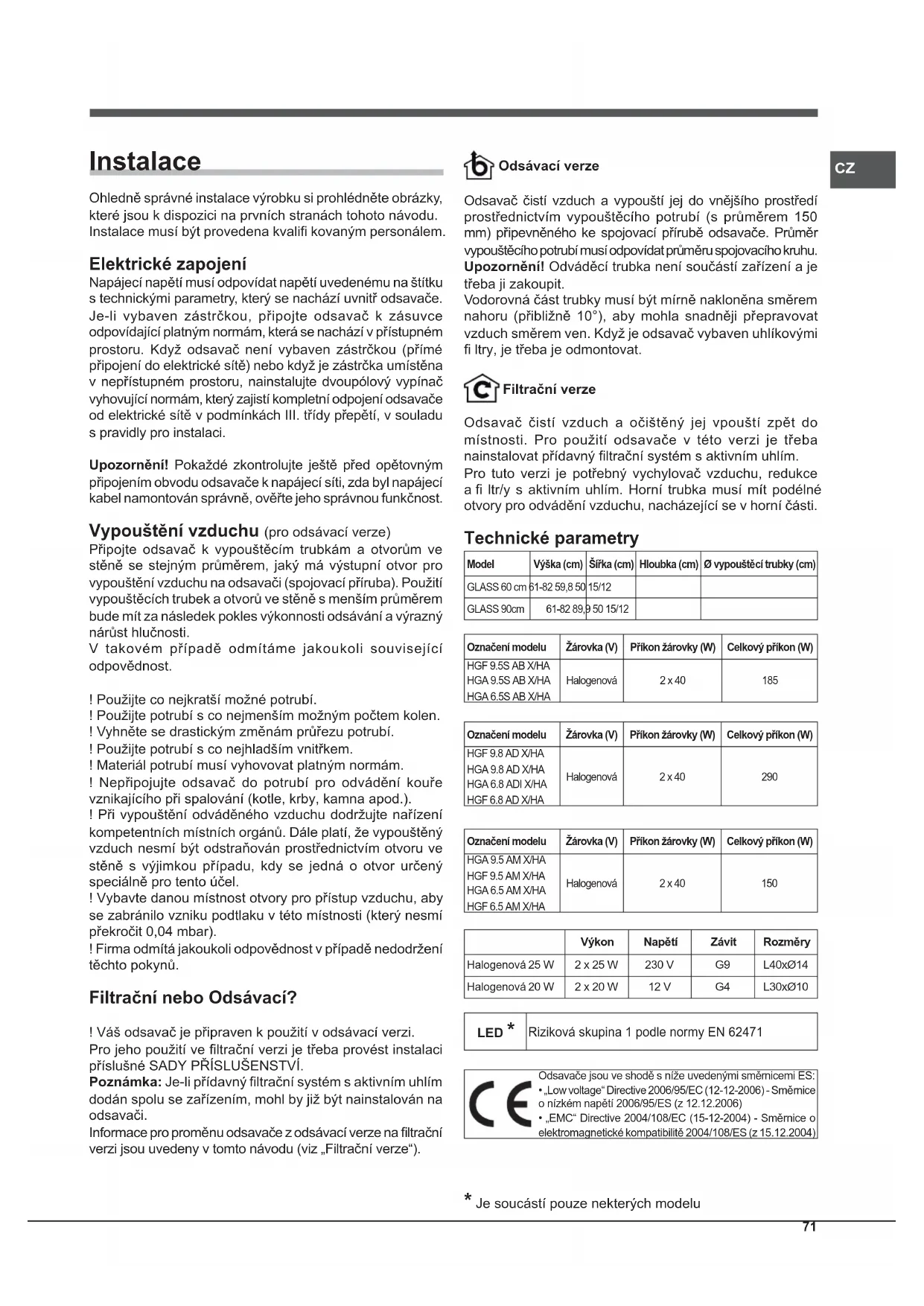 Napájecí napětí musí odpovídat napětí uvedenému na štítku s technickými parametry, který se nachází uvnitř odsavače. Je-li vybaven zástrčkou, připojte odsavač k zásuvce odpovídající platným normám, která se nachází v přístupném prostoru. Když odsavač není vybaven zástrčkou (přímé připojení do elektrické sítě) nebo když je zástrčka umístěna v nepřístupném prostoru, nainstalujte dvoupólový vypínač vyhovující normám, který zajistí kompletní odpojení odsavače od elektrické sítě v podmínkách III. třídy přepětí, v souladu s pravidly pro instalaci.
