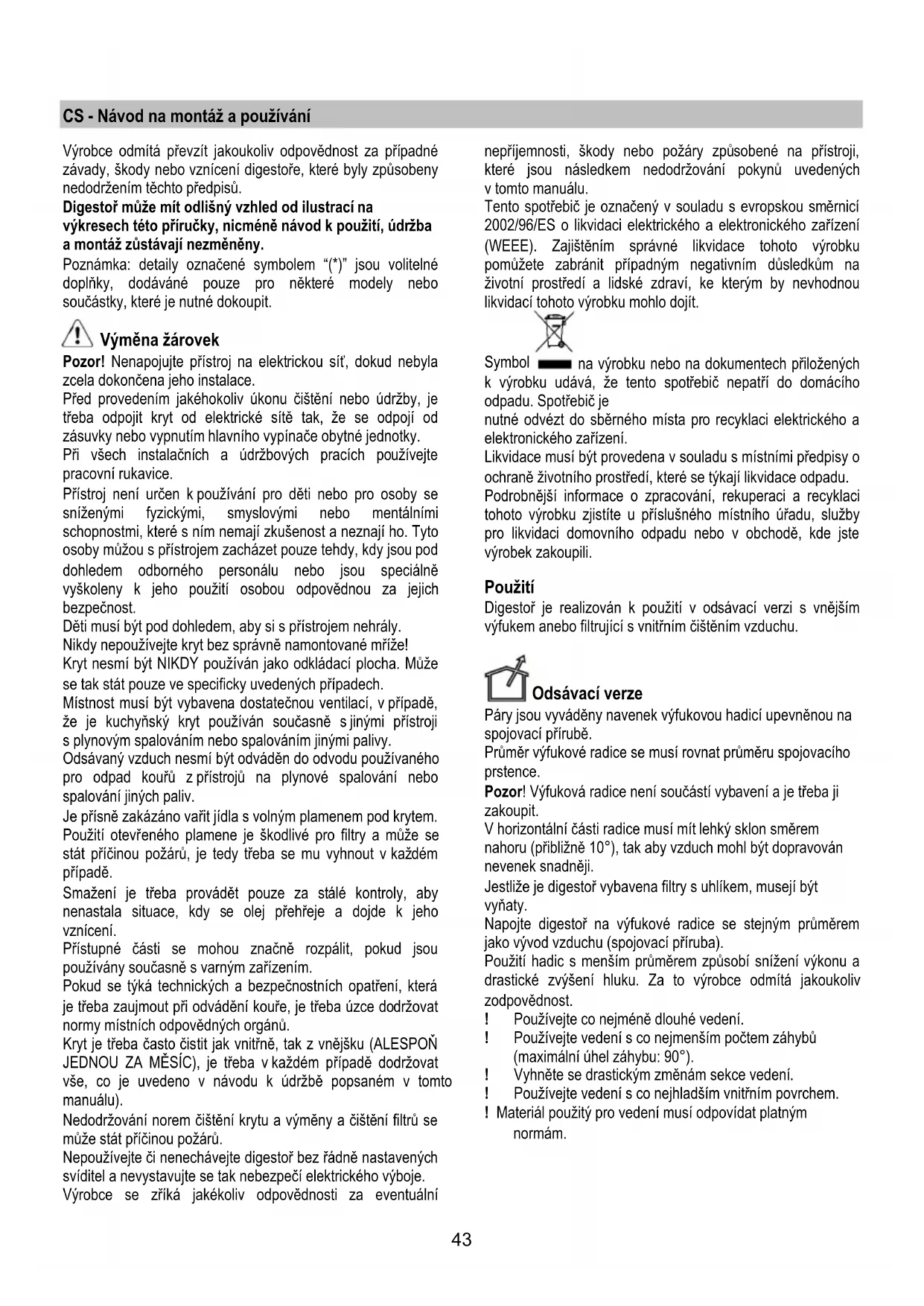 tuku a vůní. K použití digestoře v této verzi je nutné instalovat