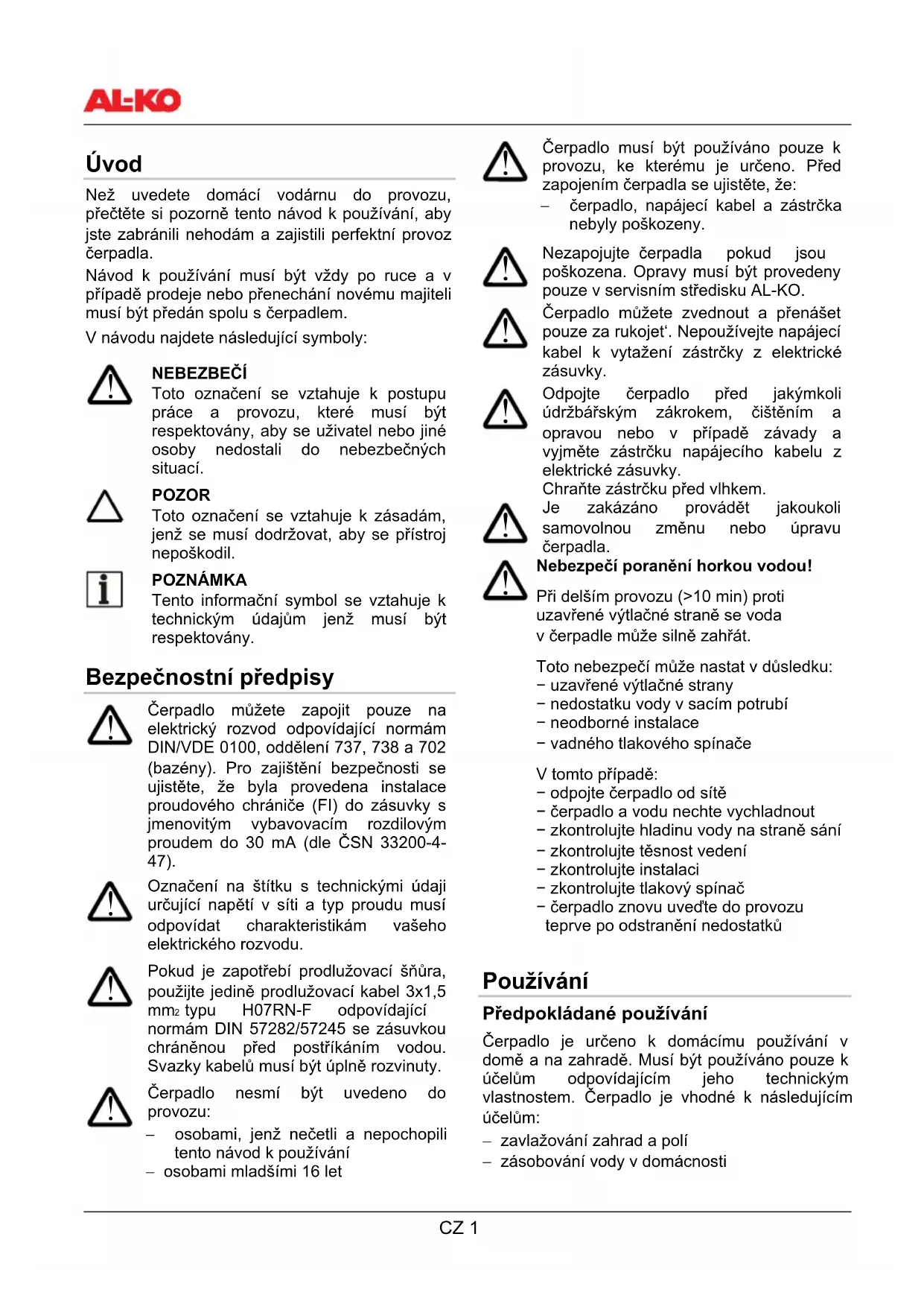 ebezpečí poranění horkou vodou! Otevřít výtlačné potrubí Výška nasávání příliš vysoká Snížit výšku nasávání Vzduch v nasávacím potrubí Zkontrolujte vzduchotěsnost nasávacího potrubí Čerpadlo se nenaplnilo Naplňte čerpadlo Příliš nízké dopravované množství Zábrana v nasávání Vyčistit nasávání Výška nasávání příliš vysoká Snížit výšku nasávání Průměr potrubí příliš malý Použít větší výtlačné portubí Výtlačná výška příliš vysoká Snížit výtlačnou výšku Při zapnutí čerpadlo není výkonné Nedostatečný tlak v nádrži Zkontrolujte tlak v nádrži na ventilu (5) a pokud je to nezbytné opravte ho. Nastavte regulaci na tlaku přibližně 1,5 barů Čerpadlo se samo nevypíná Nedostatek vody na straně sání, Čerpadlo nasává vzduch Čerpadlo odpojte, případně nechte vychladnout V případě neopravitelných závad Vás žádáme, abyste se obrátili na nejbližší Servisní službu klientů AL-KO.SK 1 0BÚvod Než uvediete domácu vodáreň do prevádzky, prečítajte si pozorne tento návod na použitie, aby ste zabránili nehodám a zaistili perfektnú prevádzku čerpadla. Návod na použitie musí byť vždy po ruke a v prípade predaja alebo prenechania novému majiteľovi musí byť odovzdaný spolu s čerpadlom. V návode nájdete nasledujúce symboly: