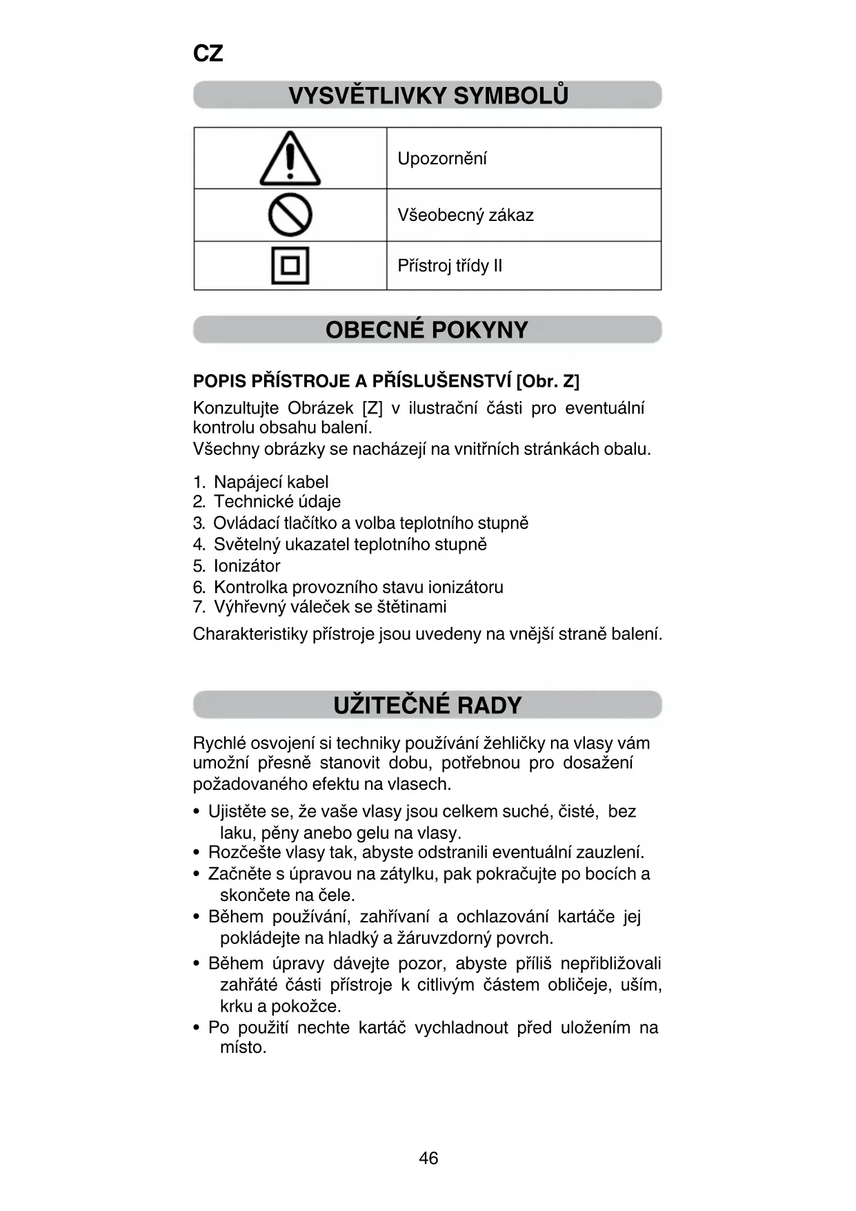 Charakteristiky přístroje jsou uvedeny na vnější straně balení.
