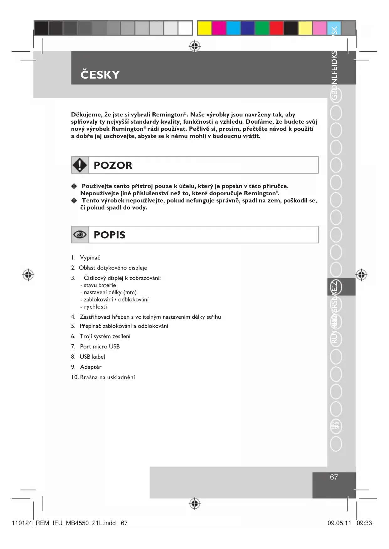 Tento výrobek nepoužívejte, pokud nefunguje správně, spadl na zem, poškodil se, či pokud spadl do vody. POPIS 1. Vypínač2. Oblast dotykového displeje3. Číslicový displej k zobrazování:- stavu baterie- nastavení délky (mm)- zablokování / odblokování- rychlosti4. Zastřihovací hřeben s volitelným nastavením délky střihu5. Přepínač zablokování a odblokování6. Trojí systém zesílení7. Port micro USB 8. USB kabel9. Adaptér10. Brašna na uskladnění ČESKY 110124_REM_IFU_MB4550_21L.indd 67 09.05.11 09:3368