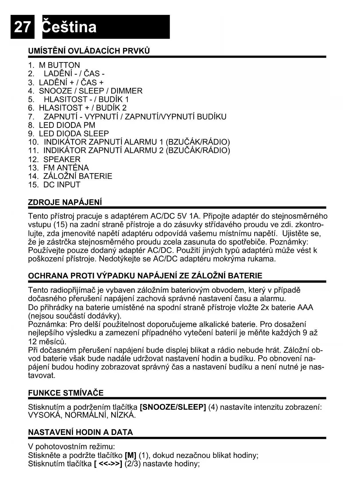 Stisknutím tlačítka [POWER] (7) zapněte přístroj; Stisknutím tlačítek [TUNING +/-] (2/3) nastavte frekvenci rádia na požadovanou stani- ci. (Pokud podržíte tlačítko ladění, bude rádio skenovat, dokud nenajde další stanici); Nastavte hlasitost pomocí tlačítek [VOLUME +/-] (5/6); Chcete-li rádio vypnout, stiskněte a podržte tlačítko [POWER] (7). Poznámka: Pro lepší příjem přeorientujte anténu (13). PŘEDVOLBY NALAĎTE POŽADOVANOU STANICI, JAK JE VYSVĚTLENO VÝŠE; STISKNĚTE A PODRŽTE TLAČÍTKO [M] (1), DOKUD NEZAČNE BLIKAT "P"; STISKNUTÍM TLAČÍTEK [TUNING +/-] (2/3) ZVOLTE ČÍSLO; STISKNĚTE TLAČÍTKO [M] (1) PRO ULOŽENÍ ROZHLASOVÉ STANICE. VYVOLÁNÍ PŘEDVOLENÉ STANICE: STISKNĚTE TLAČÍTKO [MEM] (1) A POTÉ ZVOLTE ČÍSLO PŘEDVOLBY STISKNUTÍM TLAČÍTKA [M].29 Čeština FUNKCE SLEEP Stisknutím a podržením tlačítka [SNOOZE/SLEEP] zapněte funkci spánku a poté stisknutím tlačítka [SNOOZE/SLEEP] nastavte dobu spánku: 90-80-70-60-50-40-30- 20-10-OFF. Po zapnutí funkce spánku se rozsvítí indikátor SLEEP. Stisknutím tlačítka [SNOOZE/SLEEP] uprostřed doby spánku zobrazíte náhled zbývajícího času. Po dosažení nastavené doby spánku se přístroj automaticky vyp- ne.