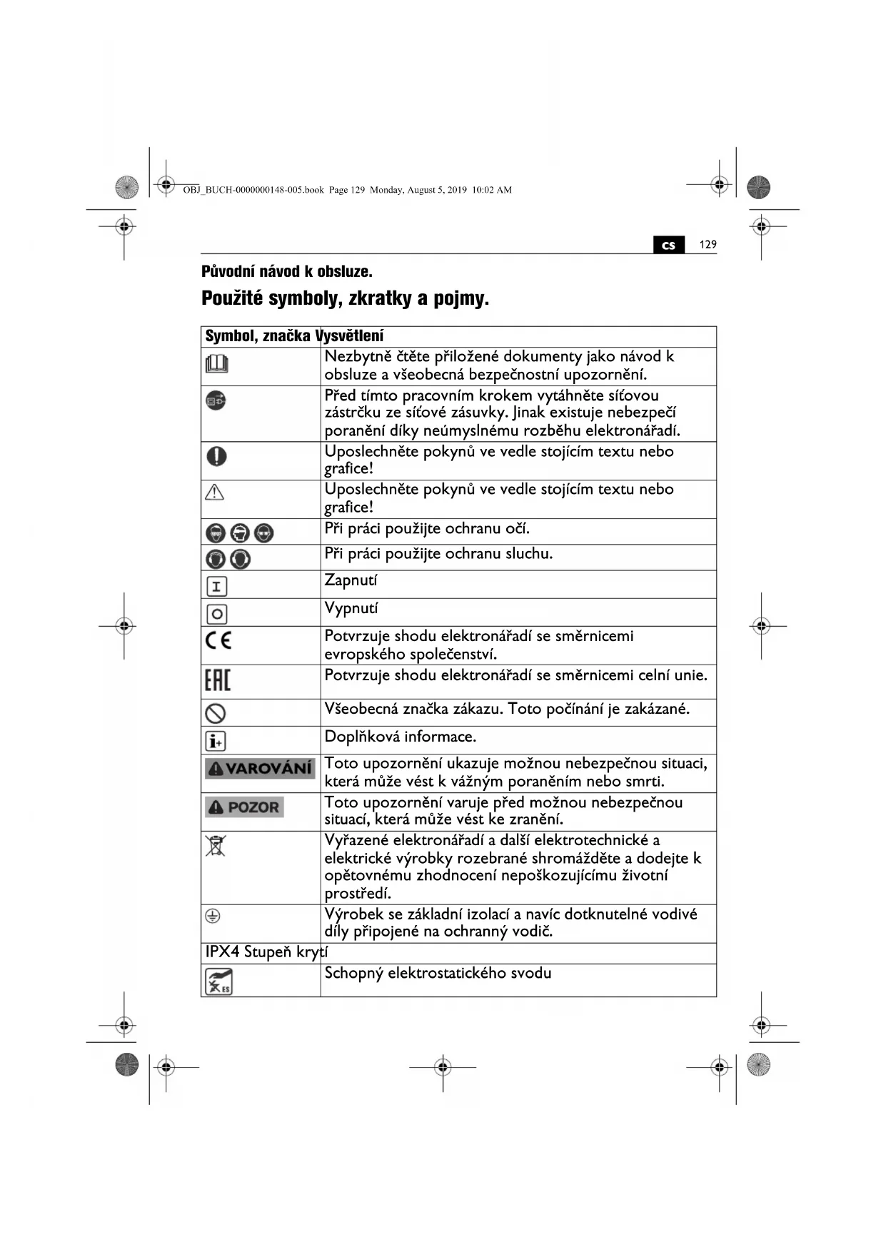 Původní návod k obsluze. Použité symboly, zkratky a pojmy. Symbol, značka Vysvětlení Nezbytně čtěte přiložené dokumenty jako návod k obsluze a všeobecná bezpečnostní upozornění. Před tímto pracovním krokem vytáhněte síťovou zástrčku ze síťové zásuvky. Jinak existuje nebezpečí poranění díky neúmyslnému rozběhu elektronářadí. Uposlechněte pokynů ve vedle stojícím textu nebo grafice! Uposlechněte pokynů ve vedle stojícím textu nebo grafice! Při práci použijte ochranu očí. Při práci použijte ochranu sluchu. Zapnutí Vypnutí Potvrzuje shodu elektronářadí se směrnicemi evropského společenství. Potvrzuje shodu elektronářadí se směrnicemi celní unie. Všeobecná značka zákazu. Toto počínání je zakázané. Doplňková informace. Toto upozornění ukazuje možnou nebezpečnou situaci, která může vést k vážným poraněním nebo smrti. Toto upozornění varuje před možnou nebezpečnou situací, která může vést ke zranění. Vyřazené elektronářadí a další elektrotechnické a elektrické výrobky rozebrané shromážděte a dodejte k opětovnému zhodnocení nepoškozujícímu životní prostředí. Výrobek se základní izolací a navíc dotknutelné vodivé díly připojené na ochranný vodič. IPX4 Stupeň krytí Schopný elektrostatického svodu OBJ_BUCH-0000000148-005.book Page 129 Monday, August 5, 2019 10:02 AM130