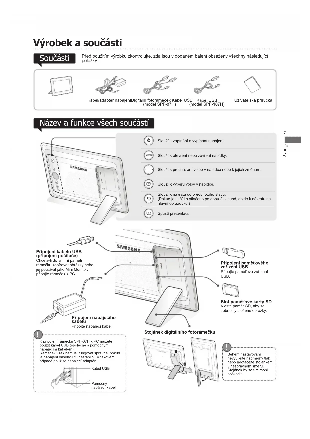 (připojení počítače) Chcete-li do vnitřní paměti rámečku kopírovat obrázky nebo jej používat jako Mini Monitor, připojte rámeček k PC. Stojánek digitálního fotorámečku Během nastavování nevyvíjejte nadměrný tlak nebo neotáčejte stojánkem v nesprávném směru. Stojánek by se tím mohl poškodit. K připojení rámečku SPF-87H k PC můžete použít kabel USB (společně s pomocným napájecím kabelem).Rámeček však nemusí fungovat správně, pokud je napájení vašeho PC nestabilní. V takovém případě použijte napájecí adaptér.Pomocný napájecí kabelKabel USB Slouží k zapínání a vypínání napájení.Slouží k otevření nebo zavření nabídky.Slouží k procházení voleb v nabídce nebo k jejich změnám.Slouží k výběru volby v nabídce.Slouží k návratu do předchozího stavu.(Pokud je tlačítko stlačeno po dobu 2 sekund, dojde k návratu na hlavní obrazovku.)Spustí prezentaci. BN68-01567J.indb 7 2009-07-14 �� 3:47:12Česky