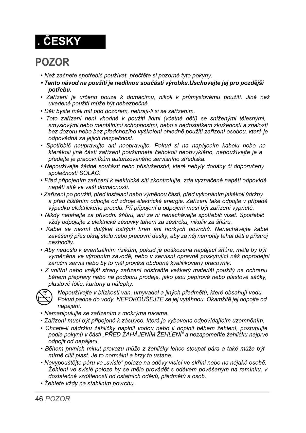 , Ped zahájením žehlení se vždy ujistte, že je z žehlicí plochy sejmutý ochranný kryt. , Vzhledem k tomu, že ve vtšin oblastí je voda z vodovodu znan tvrdá, doporuuje spolenost Solac vždy používat k žehlení destilovanou vodu. Tím zaruíte, že vašežehlika zstane po delší dobu v optimálním stavu. , Pokud z jakéhokoli dvodu nemáte destilovanou vodu k dispozici, používejte prosím vodu s nízkým obsahem minerál (mkkou vodu) nebo vodu z vodovodu pefiltrujte. , Do nádržky neaplikujte prostedky pro odvápnní nebo odstranní vodního kamene. Nepoužívejte parfémovanou vodu ani vodu prodávanou k žehlení. Tytovýrobky poškozují vnitek systému pro vývoj páry.1 Zatímco je žehlika odpojena od napájení, pesute regulátor páry (10) do zavenépolohy (Obr. 2).2 Otevete otvor pro plnní vody (5). Naplte nádržku vodou, aniž byste pekroili maximální úrove; použijte k tomu odmrku (12), která je souástí dodávky, a mjte pitom žehliku ve svislé poloze (Obr. 1). Když je nádržka plná, uzavete víko. ) Pi plnní nádržky se ujistte, že voda nepetekla pes otvor pro plnní vodou. 3 Zkontrolujte, zda má odv, který se chystáte žehlit, štítek s vyznaenou teplotoužehlení. ) Doporuujeme vám, abyste si odv rozdlili podle požadované teploty žehlení a zaali žehlením odv, které mají nejnižší teplotu žehlení (•)..1 Hlavní tleso2 Napájecí kabel3 Kovová žehlicí plocha4 Otvor na kropení5 Plnící otvor6 Nádržka na vodu7 Tlaítko kropení8 laítko intenzivního napaování9 Regulátor teploty10 Voli páry/samoištní11 Kontrolka teploty12* Odmrka na vodu (pouze u modelu PV2210)SYNTETICKÉ VLÁKNA, minimální teplota (•)HEDVÁBÍ, VLNA, stední teplota (••)BAVLNA, vysoká teplota (•••)LEN, maximální teplota (MAX)48 POUŽITÍ , POZNÁMKA: Žehlení jemných odv pi teplot vyšší, než je zapotebí, zpsobí poškození tkaniny a uchycování zbytk opálených tkanin na žehlicí ploše. , Máte-li jakékoli pochybnosti o teplot, kterou je vhodné použít na daný odv, vyzkoušejte žehlení na ásti, která není vidt, piemž zante s nejnižším nastavením teploty. POUŽITÍ ) Tento pístroj je navržen výhradn pro žehlení odv. Nepoužívejte jej k žádnému jinému úelu. ) Prvky použité pro pepravu a balení beze zbytku odstrate. n Je-li zaízení horké, manipulujte s ním opatrn a nedotýkejte se kovové žehlicí plochy. n Žehliku nikdy nenechávejte ve vodorovné poloze, když je žehlicí plocha horká. Postavte ji na zadní konec. n Pi práci s párou dávejte pozor; nemite na lidi, zvíata, ani na choulostivé pedmty. n Žehlete vždy na stabilním, pevném a hladkém povrchu. ) Velmi jemné obleení pekryjte kouskem látky, aby žehlicí plocha nezanechala na obleení stopy. 1 Napájecí kabel úpln odmotejte a pipojte k síti. Rozsvítí se kontrolka teploty (11). Žehliku dejte do svislé polohy. 2 Podle toho, jaké odvy hodláte žehlit, zvolte požadovanou teplotu (viz „VOLBA TEPLOTY (Obr. 4)“). 3 Podle poteby zvolte napaovací žehlení (stední nebo maximální ) nebo žehlení za sucha (viz „VOLBA NAPAOVÁNÍ“). 4 Uchopte žehliku za rukoje a posouvejte žehlicí plochu po odvu, který chcete vyžehlit. 5 Po skonení žehlení nastavte regulátor páry (10) do zavené polohy a regulátor teploty (9) do polohy 0. 6 Napájecí kabel vypojte ze sít. 7 Vyprázdnte vodu z nádržky (viz „VYPRÁZDNNÍ NÁDRŽKY“). Pokejte, dokud žehlika úpln nevychladne a uložte ji ve svislé poloze na bezpené místo.