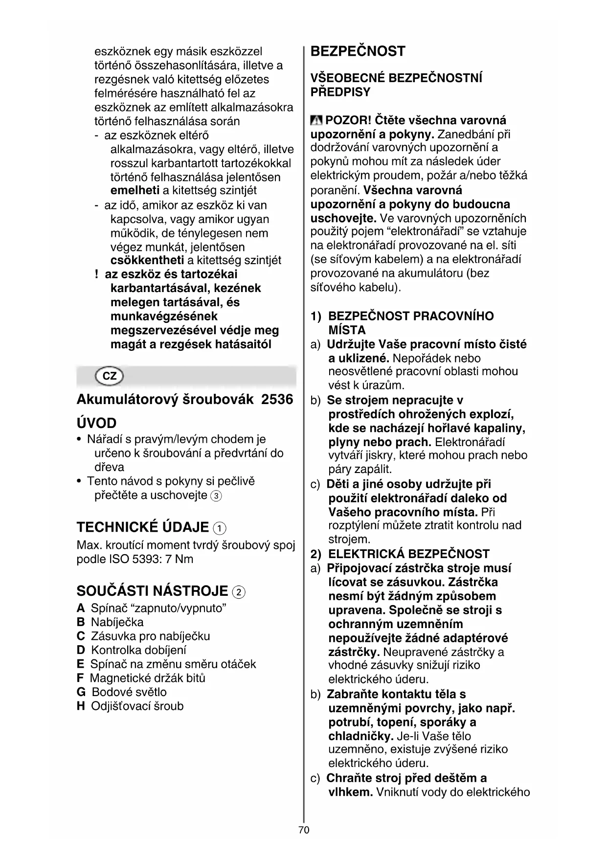 A Spínač “zapnuto/vypnuto” B Nabíječka C Zásuvka pro nabíječku D Kontrolka dobíjení E Spínač na změnu směru otáček F Magnetické držák bitů G Bodové světlo H Odjišťovací šroub BEZPEČNOST