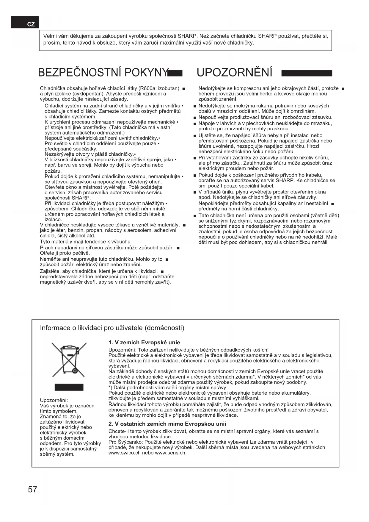 RO57 Velmi vám děkujeme za zakoupení výrobku společnosti SHARP. Než začnete chladničku SHARP používat, přečtěte si, prosím, tento návod k obsluze, který vám zaručí maximální využití vaší nové chladničky.Chladnička obsahuje hořlavé chladící látky (R600a: izobutan) ■a plyn izolace (cyklopentan). Abyste předešli vznícení a výbuchu, dodržujte následující zásady.Chladicí systém na zadní straně chladničky a v jejím vnitřku • obsahuje chladící látky. Zamezte kontaktu ostrých předmětů s chladicím systémem.K urychlení procesu odmrazení nepoužívejte mechanické • přístroje ani jiné prostředky. (Tato chladnička má vlastní systém automatického odmrazení.)Nepoužívejte elektrická zařízení uvnitř chladničky.• Pro světlo v chladícím oddělení používejte pouze • předepsané součástky.Nezakrývejte otvory v plášti chladničky.• V blízkosti chladničky nepoužívejte vznětlivé spreje, jako • např. barvu ve spreji. Mohlo by dojít k výbuchu nebo požáru.Pokud dojde k proražení chladicího systému, nemanipulujte • se síťovou zásuvkou a nepoužívejte otevřený oheň. Otevřete okno a místnost vyvětrejte. Poté požádejte o servisní zásah pracovníka autorizovaného servisu společnosti SHARP.Při likvidaci chladničky je třeba postupovat náležitým • způsobem. Chladničku odevzdejte ve sběrném místě určeném pro zpracování hořlavých chladících látek a izolace.V chladničce neskladujte vysoce těkavé a vznětlivé materiály, ■jako je éter, benzín, propan, nádoby s aerosolem, adhezívní činidla, čistý alkohol atd. Tyto materiály mají tendence k výbuchu.Prach napadaný na síťovou zástrčku může způsobit požár. ■Otřete ji proto pečlivě.Neměňte ani neupravujte tuto chladničku. Mohlo by to ■způsobit požár, elektrický úraz nebo zranění.Zajistěte, aby chladnička, která je určena k likvidaci, ■nepředstavovala žádné nebezpečí pro děti (např. odstraňte magnetický uzávěr dveří, aby se v ní děti nemohly zavřít).