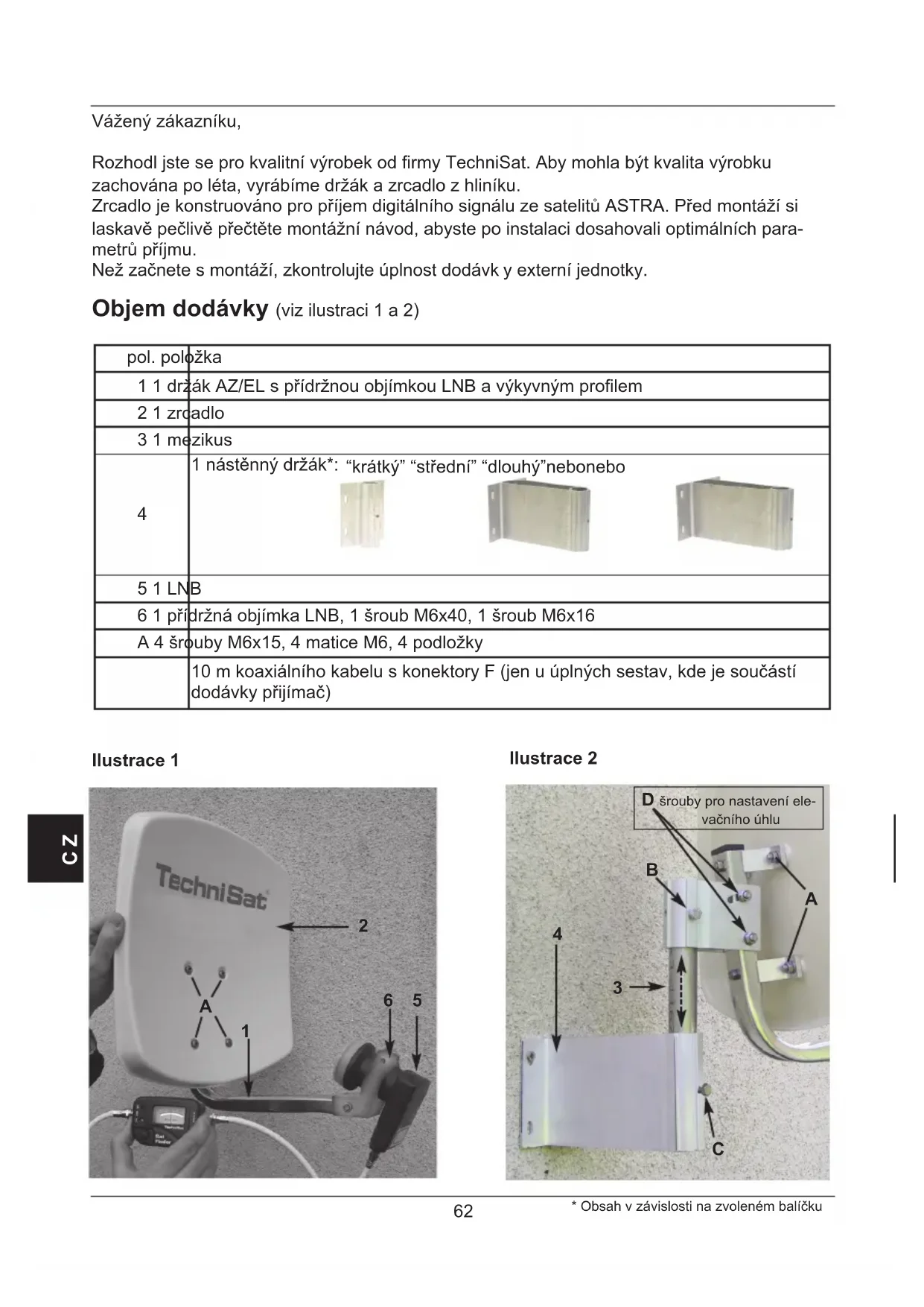 D šrouby pro nastavení ele- vačního úhlu Ilustrace 1 Ilustrace 2 pol. položka 1 1 držák AZ/EL s přídržnou objímkou LNB a výkyvným profilem 2 1 zrcadlo 3 1 mezikus