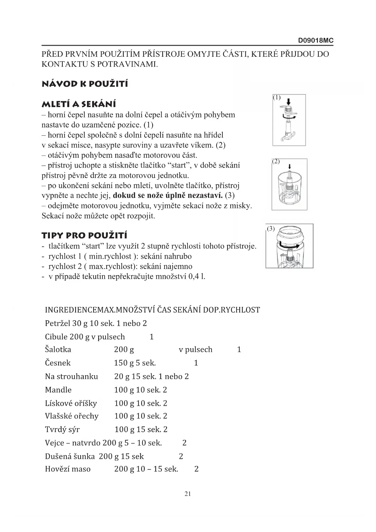 UPOZORNĚNÍ : TENTO PŘÍSTROJ JE URČEN PRO POUŽÍVANÍ S PŘERUŠOVANÝM CHODEM. POTRAVINY PROTO ZPRACOVÁVEJTE POUZE PULZNĚ .
