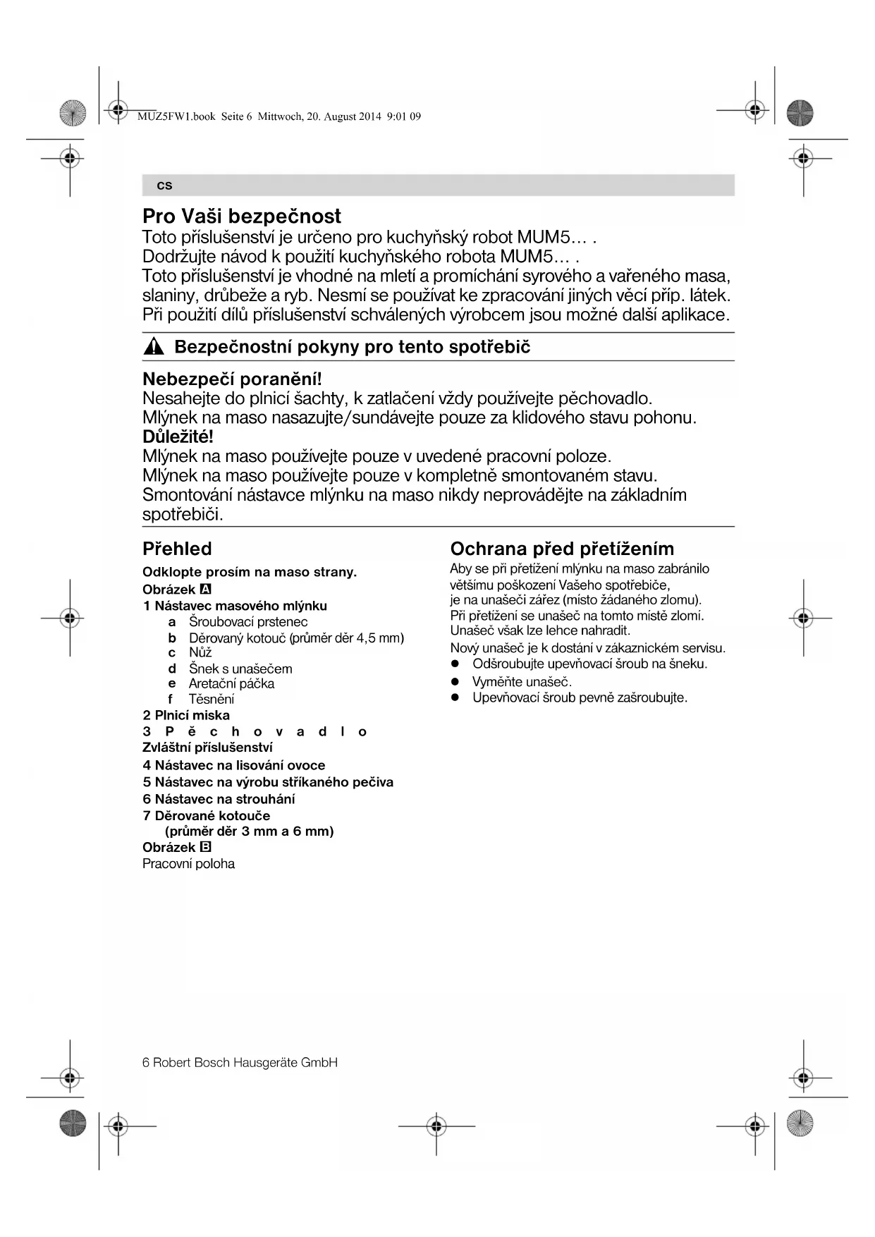 Zastrzega siê prawo wprowadzania zmian. MUZ5FW1.book Seite 5 Mittwoch, 20. August 2014 9:01 096 Robert Bosch Hausgeräte GmbH Pro Vaši bezpečnost Toto pøíslušenství je určeno pro kuchyòský robot MUM5... . Dodržujte návod k použití kuchyòského robota MUM5... . Toto pøíslušenství je vhodné na mletí a promíchání syrového a vaøeného masa, slaniny, drùbeže a ryb. Nesmí se používat ke zpracování jiných vìcí pøíp. látek. Pøi použití dílù pøíslušenství schválených výrobcem jsou možné další aplikace. , Bezpečnostní pokyny pro tento spotøebič Nebezpečí poranìní! Nesahejte do plnicí šachty, k zatlačení vždy používejte pìchovadlo. Mlýnek na maso nasazujte/sundávejte pouze za klidového stavu pohonu. Dùležité! Mlýnek na maso používejte pouze v uvedené pracovní poloze. Mlýnek na maso používejte pouze v kompletnì smontovaném stavu. Smontování nástavce mlýnku na maso nikdy neprovádìjte na základním spotøebiči. Pøehled Odklopte prosím na maso strany. Obrázek 1 Nástavec masového mlýnku