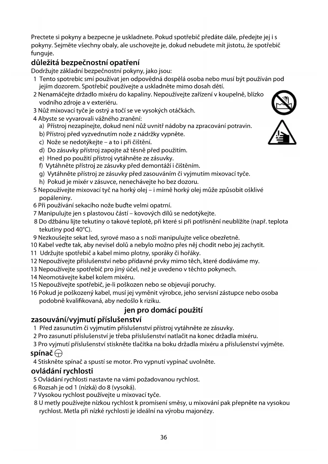2 Nenamáčejte držadlo mixéru do kapaliny. Nepoužívejte zařízení v koupelně, blízko
