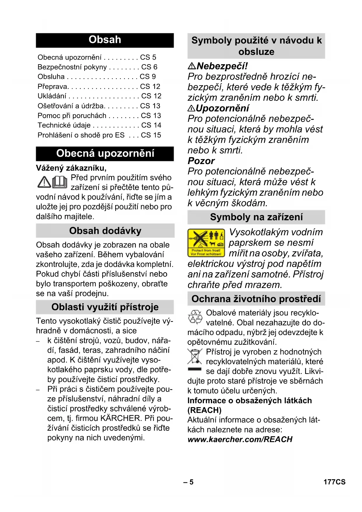 EN 61000–3–3: 2008 EN 62233: 2008 Követett megfelelés megállapítási el- járás: 2000/14/EK: V. függelék Hangteljesítményszint dB(A) Mért: 87 Garantált: 90 CEO Head of Approbation Winnenden, 2013/07/01 176 HU– 5 Vážený zákazníku, Před prvním použitím svého zařízení si přečtěte tento pů- vodní návod k používání, řiďte se jím a uložte jej pro pozdější použití nebo pro dalšího majitele. Obsah dodávky je zobrazen na obale vašeho zařízení. Během vybalování zkontrolujte, zda je dodávka kompletní. Pokud chybí části příslušenství nebo bylo transportem poškozeny, obraťte se na vaší prodejnu. Tento vysokotlaký čistič používejte vý- hradně v domácnosti, a sice – k čištění strojů, vozů, budov, nářa- dí, fasád, teras, zahradního náčiní apod. K čištění využívejte vyso- kotlakého paprsku vody, dle potře- by používejte čisticí prostředky. – Při práci s čističem používejte pou- ze příslušenství, náhradní díly a čisticí prostředky schválené výrob- cem, tj. firmou KÄRCHER. Při pou- žívání čisticích prostředků se řiďte pokyny na nich uvedenými. Nebezpečí! Pro bezprostředně hrozící ne- bezpečí, které vede k těžkým fy- zickým zraněním nebo k smrti. 몇 Upozornění Pro potencionálně nebezpeč- nou situaci, která by mohla vést k těžkým fyzickým zraněním nebo k smrti. Pozor Pro potencionálně nebezpeč- nou situaci, která může vést k lehkým fyzickým zraněním nebo k věcným škodám. Vysokotlakým vodním paprskem se nesmí mířit na osoby, zvířata, elektrickou výstroj pod napětím ani na zařízení samotné. Přístroj chraňte před mrazem. Obalové materiály jsou recyklo- vatelné. Obal nezahazujte do do- mácího odpadu, nýbrž jej odevzdejte k opětovnému zužitkování. Přístroj je vyroben z hodnotných recyklovatelných materiálů, které se dají dobře znovu využít. Likvi- dujte proto staré přístroje ve sběrnách k tomuto účelu určených. Informace o obsažených látkách (REACH) Aktuální informace o obsažených lát- kách naleznete na adrese: www.kaercher.com/REACH Obsah Obecná upozornění . . . . . . . . . CS 5 Bezpečnostní pokyny . . . . . . . . CS 6 Obsluha . . . . . . . . . . . . . . . . . . CS 9 Přeprava. . . . . . . . . . . . . . . . . . CS 12 Ukládání . . . . . . . . . . . . . . . . . . CS 12 Ošetřování a údržba. . . . . . . . . CS 13 Pomoc při poruchách . . . . . . . . CS 13 Technické údaje . . . . . . . . . . . . CS 14 Prohlášení o shodě pro ES . . . CS 15 Obecná upozornění Obsah dodávky Oblasti využití přístroje Symboly použité v návodu k obsluze Symboly na zařízení Ochrana životního prostředí 177CS– 6 V každé zemi platí záruční podmínky vydané příslušnou distribuční společ- ností. Případné poruchy zařízení od- straníme během záruční lhůty bezplat- ně, pokud byl jejich příčinou vadný ma- teriál nebo výrobní závady. V případě uplatňování nároku na záruku se s do- kladem o zakoupení obraťte na prodej- ce nebo na nejbližší oddělení služeb zákazníkům. (Adresy poboček najdete na zadní straně) Nebezpečí! Zástrčky a zásuvky se nikdy nedotýkejte mokrýma ruka- ma. Zařízení nikdy neuvádějte do provozu, je-li poškozeno síťo- vé napájecí vedení nebo dů- ležité části zařízení, např. vy- sokotlaká hadice, ruční stří- kací pistole nebo bezpeč- nostní mechanismy. Před každým zahájením pro- vozu zkontrolujte, zda síťové napájecí vedení a síťová zá- strčka nejsou poškozeny. Po- škozené síťové napájecí ve- dení dejte neprodleně vymě- nit autorizovaným zákaznic- kým servisem / odborníkem elektrikářem. Vždy než začnete s přístro- jem pracovat, zkontrolujte vy- sokotlakou hadici, zda není poškozená. Poškozenou ha- dici ihned vyměňte. Nikdy nepracujte s vysokotla- kým čističem v prostorách, ve kterých hrozí nebezpečí ex- ploze! Používáte-li přístroj v nebez- pečných prostorách (např. benzinová pumpa), dodržujte bezpodmínečně příslušné bezpečnostní předpisy. Paprsek vysokého tlaku vody může být nebezpečný, je-li s ním zacházeno neodborným způsobem. Paprsek vysoké- ho tlaku nikdy nesměřujte na osoby, zvířata, zapnutá elek- trická zařízení či na samotný čistič. Vysokotlakým vodním pa- prskem nikdy nemiřte na jiné osoby ani na sebe za účelem očištění oděvu či obuvi. Nikdy neostřikujte předměty obsahující látky životu nebez- pečné (např. azbest). Pneumatikám/ventilům pneu- matik hrozí poškození resp. prasknutí při ostřikování vy- sokotlakým paprskem. Prv- ním příznakem takového po- škození je zabarvení pneu- matiky. Poškozené pneumati- ky/ventily pneumatik jsou ži- votu nebezpečné. Při čištění dodržujte vzdálenost paprsku vody nejméně 30 cm! Nebezpečí exploze! Nepoužívejte hořlavé tekutiny. Nikdy nenasávejte kapaliny obsahující rozpouštědla či neředěné kyseliny a rozpouš- tědla! Záruka Bezpečnostní pokyny 178 CS– 7 Sem patří např. benzín, ředi- dla do barev nebo topný olej. Rozprášená mlha je vysoce vznětlivá, výbušná a jedova- tá. Nepoužívejte aceton, ne- ředěné kyseliny a rozpouštědla, neboť mohou poškodit materiál, z něhož je zařízení vyrobeno. 몇 Upozornění Síťová zástrčka a spojka pro- dlužovacího vedení musejí být vodotěsné a nesmějí ležet ve vodě. Spojka nesmí dále leže na podlaze. Doporučuje- me používat kabelové bubny, které zaručují, že se zásuvky nacházejí nejméně 60 mm nad zemí. Nevhodná elektrická prodlu- žovací vedení mohou být ne- bezpečná. V otevřených pro- storách používejte jen taková elektrická prodlužovací vede- ní, která jsou k tomuto účelu schválena a odpovídajícím způsobem označena a mají dostatečný 