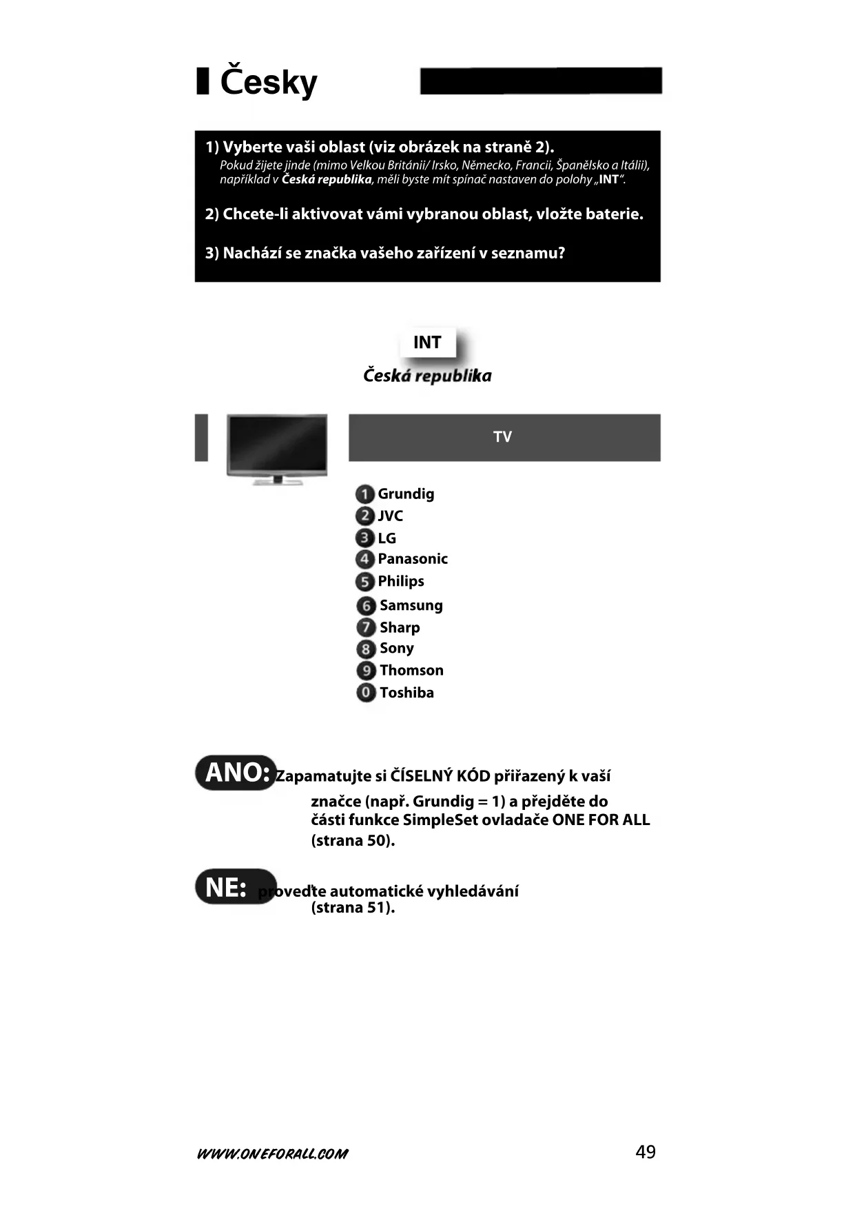 50 WWW.ONEFORALL.COM ONE FOR ALL SimpleSet Umožňuje vám během pár minut nastavit nejpopulárnější značky zařízení.Jednoduše vyhledejte ČÍSELNÝ KÓD přiřazený k vaší značce (strana 49) apostupujte podle kroků A–B. Acer Acer Stiskněte a podržte „Tlačítko ČÍSELNÉHOKÓDU přiřazeného k vaší značce“ např. Grundig = (viz strana 49) dokud se zařízení NEVYPNE!(to může trvat až 40 sekund) PŘIPRAVENO !