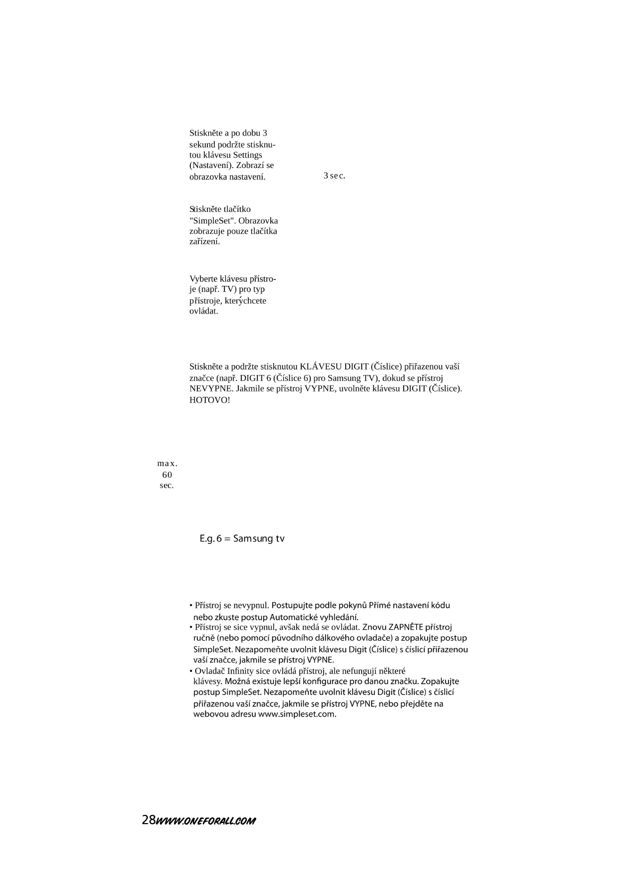 INFINITI-105x230 manual_14-talen_RDN-1230113:Infinity Manual_gedrukt 23-01-13 11:21 Pagina 2728 WWW.ONEFORALL.COM Stiskněte a podržte stisknutou KLÁVESU DIGIT (Číslice) přiřazenou vašíznačce (např. DIGIT 6 (Číslice 6) pro Samsung TV), dokud se přístrojNEVYPNE. Jakmile se přístroj VYPNE, uvolněte klávesu DIGIT (Číslice).HOTOVO!• Přístroj se nevypnul. Postupujte podle pokynů Přímé nastavení kódu nebo zkuste postup Automatické vyhledání.• Přístroj se sice vypnul, avšak nedá se ovládat. Znovu ZAPNĚTE přístroj ručně (nebo pomocí původního dálkového ovladače) a zopakujte postup SimpleSet. Nezapomeňte uvolnit klávesu Digit (Číslice) s číslicí přiřazenou vaší značce, jakmile se přístroj VYPNE.• Ovladač Infinity sice ovládá přístroj, ale nefungují některé klávesy. Možná existuje lepší konfigurace pro danou značku. Zopakujte postup SimpleSet. Nezapomeňte uvolnit klávesu Digit (Číslice) s číslicí přiřazenou vaší značce, jakmile se přístroj VYPNE, nebo přejděte na webovou adresu www.simpleset.com.Stiskněte a po dobu 3 s ekund podržte stisknu-tou klávesu Settings(Nastavení). Zobrazí seobrazovka nastavení. S tiskněte tlačítko"SimpleSet". Obrazovkazobrazuje pouze tlačítka z ařízení.Vyberte klávesu přístro- j e (např. TV) pro typ p řístroje, ktery chcete ovládat. 2