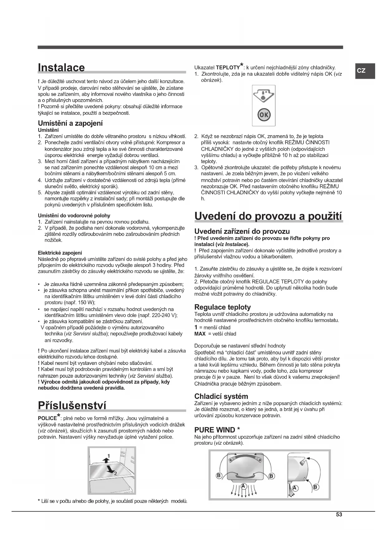 Uvedení do provozu a použití Uvedení zařízení do provozu ! Před uvedením zařízení do provozu se řiďte pokyny pro instalaci (viz Instalace).! Před zapojením zařízení dokonale vyčistěte jednotlivé prostory a příslušenství vlažnou vodou a bikarbonátem.1. Zasuňte zástrčku do zásuvky a ujistěte se, že dojde k rozsvícení žárovky vnitřního osvětlení.2. Přetočte otočný knoík REGULACE TEPLOTY do polohy odpovídající průměrné hodnotě. Do uplynutí několika hodin bude možné vložit potraviny do chladničky. Regulace teploty Teplota uvnitř chladicího prostoru je udržována automaticky na hodnotě nastavené prostřednictvím otočného knoíku termostatu. 1 = menší chlad MAX = vetší chladDoporučuje se nastavení střední hodnotySpotřebič má “chladící část” umístěnou uvnitř zadní stěny chladícího dílu. Je tomu tak proto, aby byl k dispozici větší prostor a také kvůli lepšímu vzhledu. Během činnosti je tato stěna pokryta námrazou nebo kapkami vody, podle toho, zda kompresor pracuje či je v pauze. Není to však důvod k vašemu znepokojení! Chladnička pracuje běžným způsobem. Chladicí systém Zařízení je vybaveno jedním z níže popsaných chladicích systémů: Je důležité rozeznat, o který se jedná, a brát jej v úvahu při určování způsobu konzervace potravin. PURE WIND * Na jeho přítomnost upozorňuje zařízení na zadní stěně chladicího prostoru (viz obrázek).