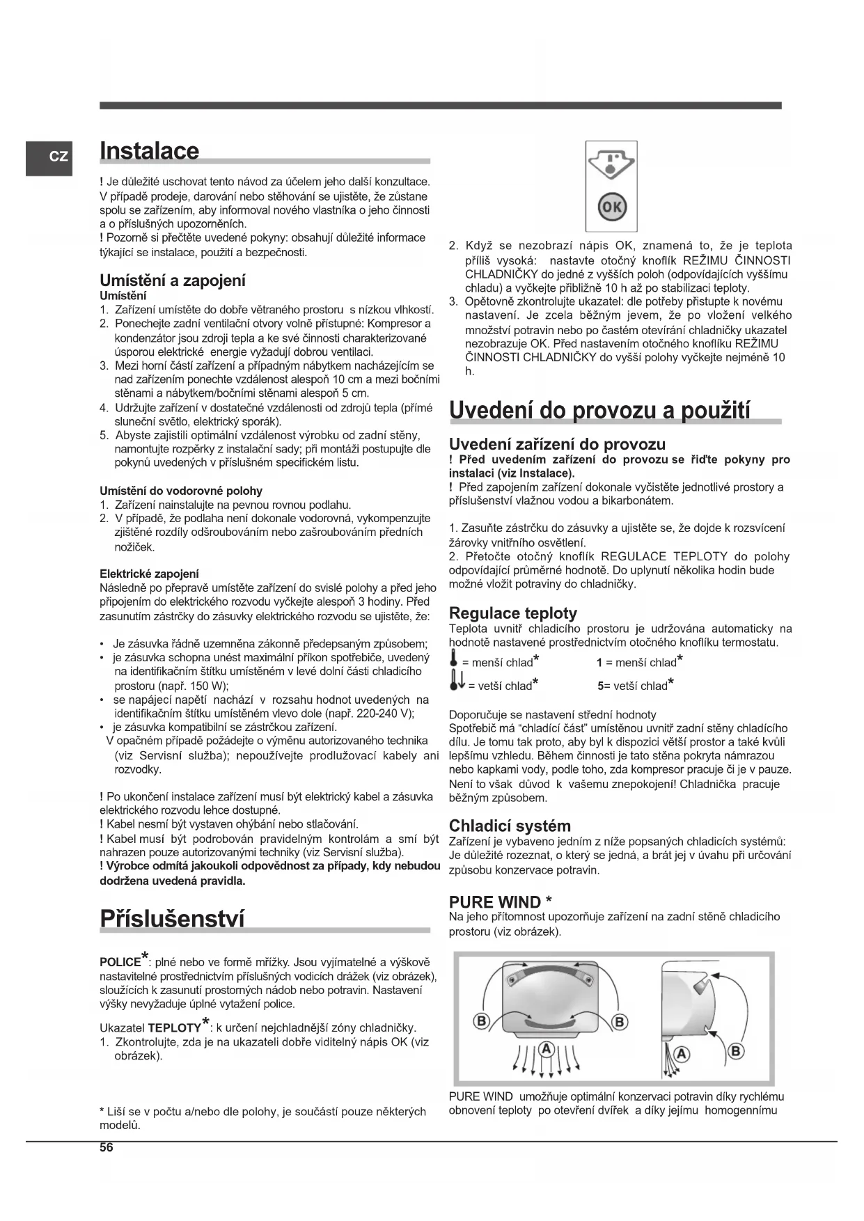 = vetší chlad* 5= vetší chlad* Doporučuje se nastavení střední hodnotySpotřebič má “chladící část” umístěnou uvnitř zadní stěny chladícího dílu. Je tomu tak proto, aby byl k dispozici větší prostor a také kvůli lepšímu vzhledu. Během činnosti je tato stěna pokryta námrazou nebo kapkami vody, podle toho, zda kompresor pracuje či je v pauze. Není to však důvod k vašemu znepokojení! Chladnička pracuje běžným způsobem. Chladicí systém Zařízení je vybaveno jedním z níže popsaných chladicích systémů: Je důležité rozeznat, o který se jedná, a brát jej v úvahu při určování způsobu konzervace potravin. PURE WIND * Na jeho přítomnost upozorňuje zařízení na zadní stěně chladicího prostoru (viz obrázek).