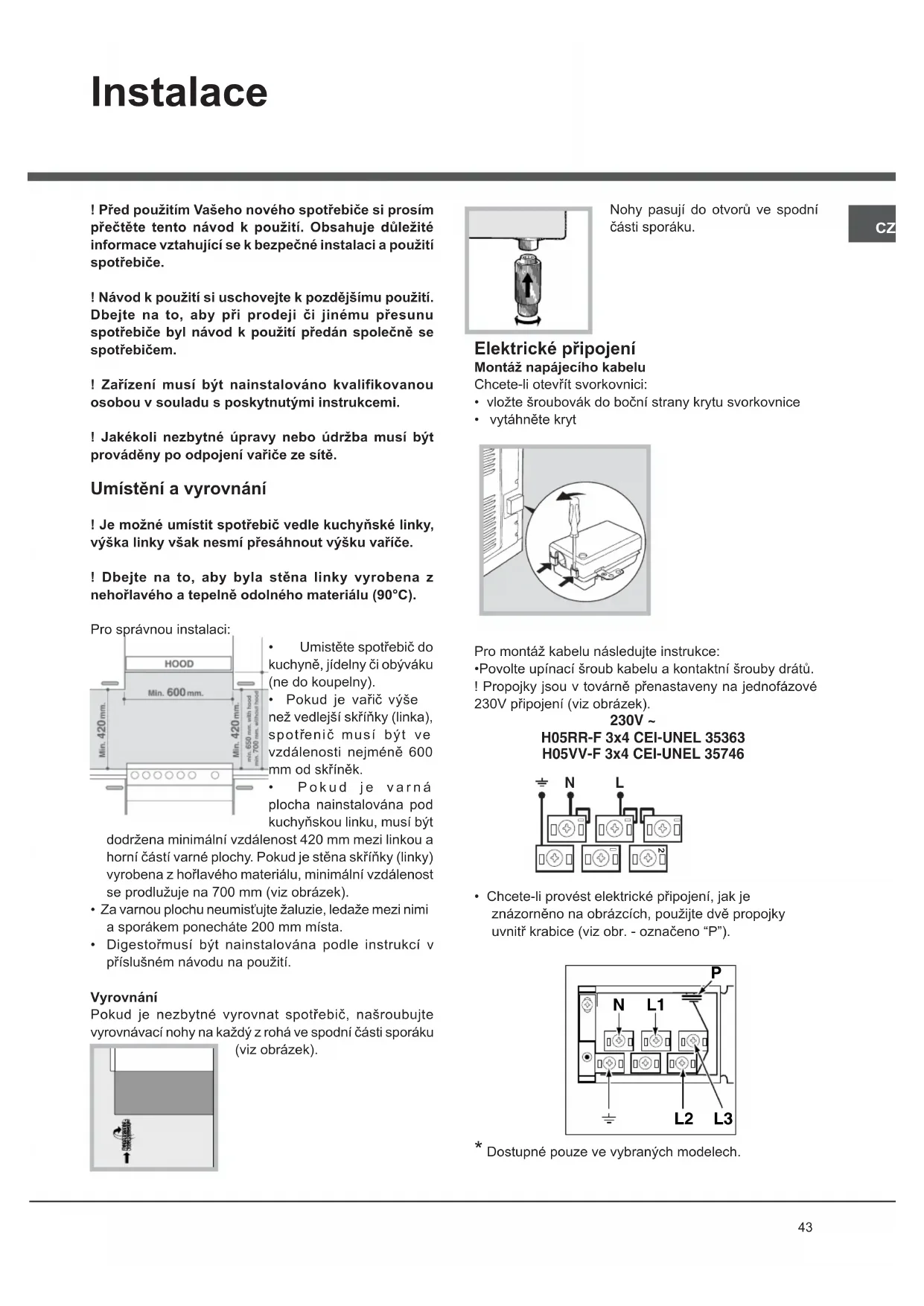 kuchyně, jídelny či obýváku (ne do koupelny).• Pokud je vařič výše než vedlejší skříňky (linka), spotřenič musí být ve vzdálenosti nejméně 600 mm od skříněk.• Pokud je varná plocha nainstalována pod kuchyňskou linku, musí být dodržena minimální vzdálenost 420 mm mezi linkou a horní částí varné plochy. Pokud je stěna skříňky (linky) vyrobena z hořlavého materiálu, minimální vzdálenost se prodlužuje na 700 mm (viz obrázek). • Za varnou plochu neumisťujte žaluzie, ledaže mezi nimi a sporákem ponecháte 200 mm místa.• Digestořmusí být nainstalována podle instrukcí v příslušném návodu na použití. Vyrovnání Pokud je nezbytné vyrovnat spotřebič, našroubujte vyrovnávací nohy na každý z rohá ve spodní části sporáku (viz obrázek).Nohy pasují do otvorů ve spodní části sporáku. Elektrické připojení Montáž napájecího kabeluChcete-li otevřít svorkovnici:• vložte šroubovák do boční strany krytu svorkovnice• vytáhněte krytPro montáž kabelu následujte instrukce:•Povolte upínací šroub kabelu a kontaktní šrouby drátů. ! Propojky jsou v továrně přenastaveny na jednofázové 230V připojení (viz obrázek).• Chcete-li provést elektrické připojení, jak je znázorněno na obrázcích, použijte dvě propojky uvnitř krabice (viz obr. - označeno “P”). * Dostupné pouze ve vybraných modelech.