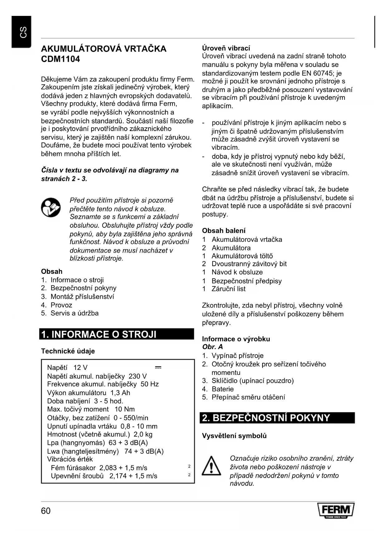 CDM1104 Děkujeme Vám za zakoupení produktu rmy Ferm. Zakoupením jste získali jedinečný výrobek, který dodává jeden z hlavných evropských dodavatelů. Všechny produkty, které dodává rma Ferm, se vyrábí podle nejvyšších výkonnostních a bezpečnostních standardů. Součástí naší lozoe je i poskytování prvotřídního zákaznického servisu, který je zajištěn naší komplexní zárukou. Doufáme, že budete moci používat tento výrobek během mnoha příštích let. Čísla v textu se odvolávají na diagramy na stranách 2 - 3. Před použitím přístroje si pozorně přečtěte tento návod k obsluze. Seznamte se s funkcemi a základní obsluhou. Obsluhujte přístroj vždy podle pokynů, aby byla zajištěna jeho správná funkčnost. Návod k obsluze a průvodní dokumentace se musí nacházet v blízkosti přístroje. Obsah