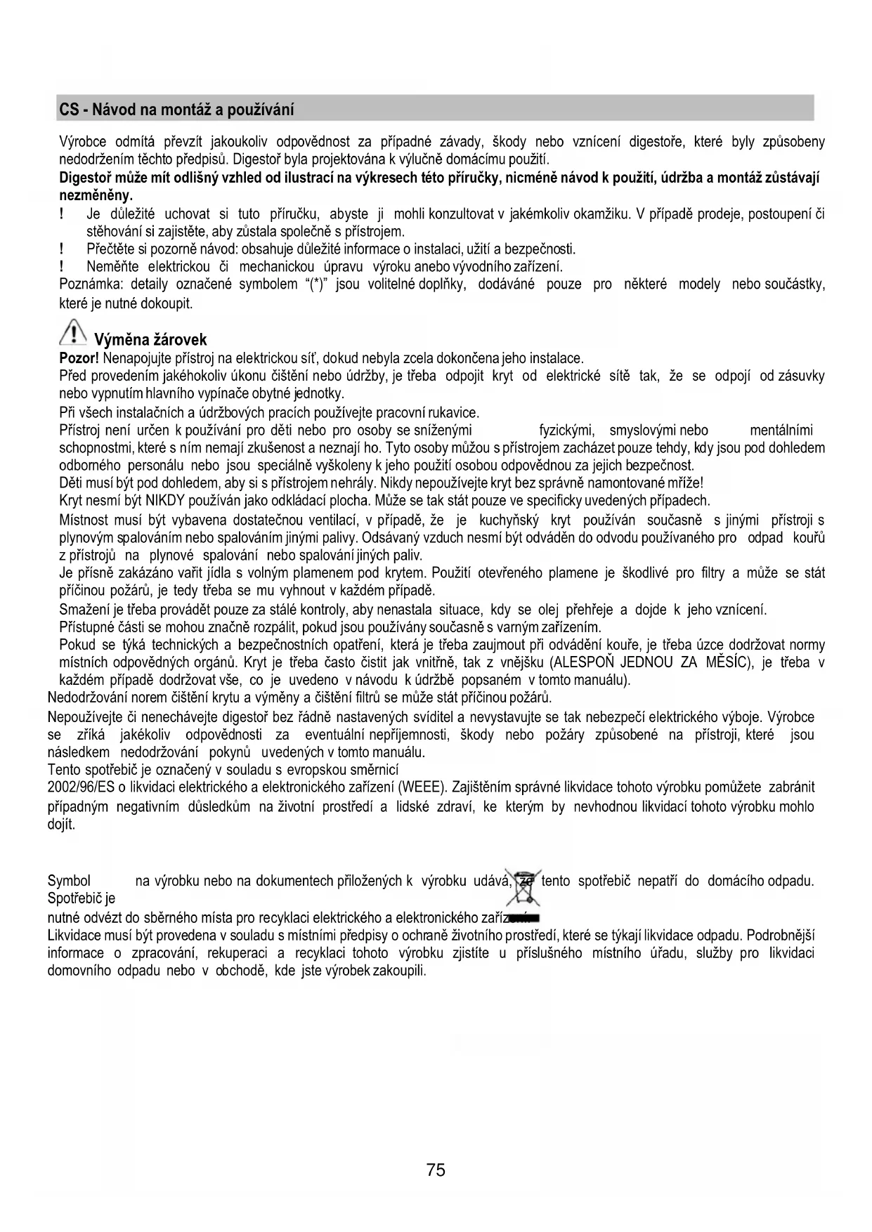 nedodržením těchto předpisů. Digestoř byla projektována k výlučně domácímu použití.