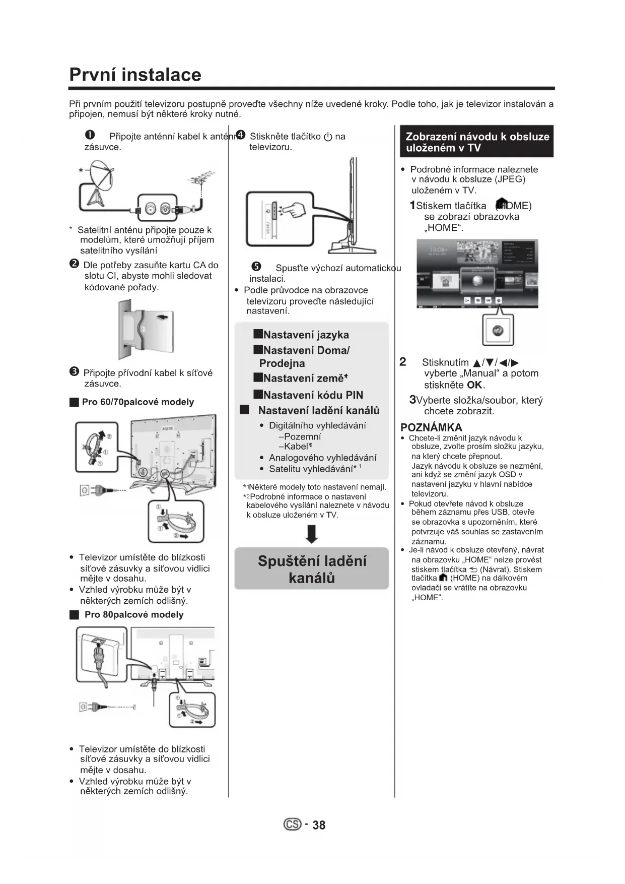 Při prvním použití televizoru postupně proveďte všechny níže uvedené kroky. Podle toho, jak je televizor instalován a připojen, nemusí být některé kroky nutné. n Připojte anténní kabel k anténní zásuvce.* Satelitní anténu připojte pouze k modelům, které umožňují příjem satelitního vysílání o Dle potřeby zasuňte kartu CA do slotu CI, abyste mohli sledovat kódované pořady. p Připojte přívodní kabel k síťové zásuvce.H Pro 60/70palcové modely• Televizor umístěte do blízkosti síťové zásuvky a síťovou vidlici mějte v dosahu.• Vzhled výrobku může být v některých zemích odlišný.H Pro 80palcové modely• Televizor umístěte do blízkosti síťové zásuvky a síťovou vidlici mějte v dosahu.• Vzhled výrobku může být v některých zemích odlišný. q Stiskněte tlačítko a na televizoru. r Spusťte výchozí automatickou instalaci.• Podle průvodce na obrazovce televizoru proveďte následující nastavení. ■ Nastavení jazyka