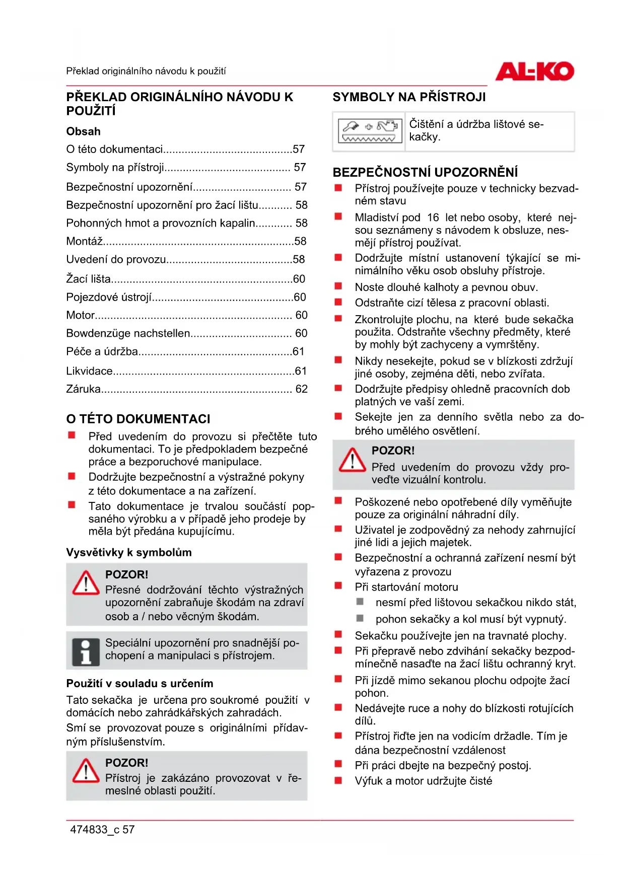 Téléchargez la notice de votre Sekačka na trávu au format PDF gratuitement ! Retrouvez votre notice BM 875 III - AL-KO et reprennez votre appareil électronique en main. Sur cette page sont publiés tous les documents nécessaires à l'utilisation de votre appareil BM 875 III de la marque AL-KO.