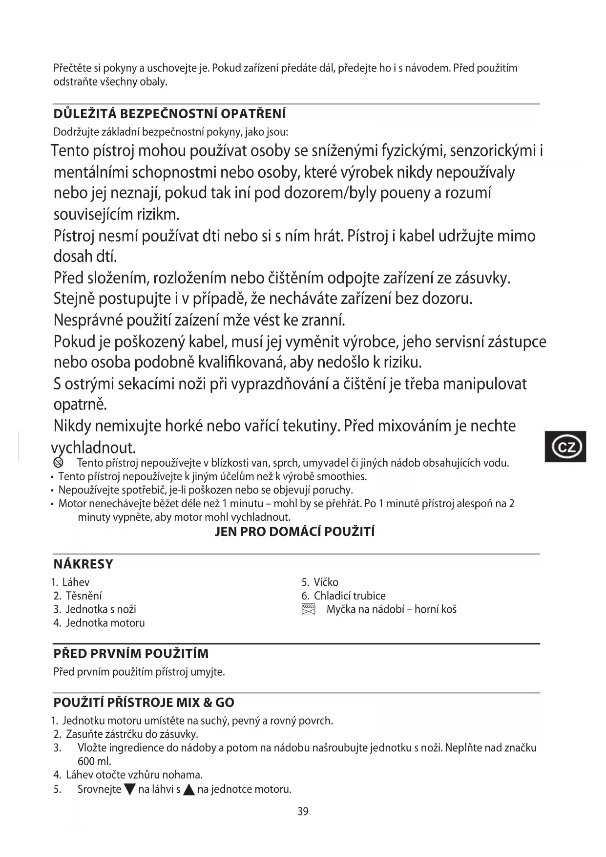 - Tento přístroj nepoužívejte k jiným účelům než k výrobě smoothies.