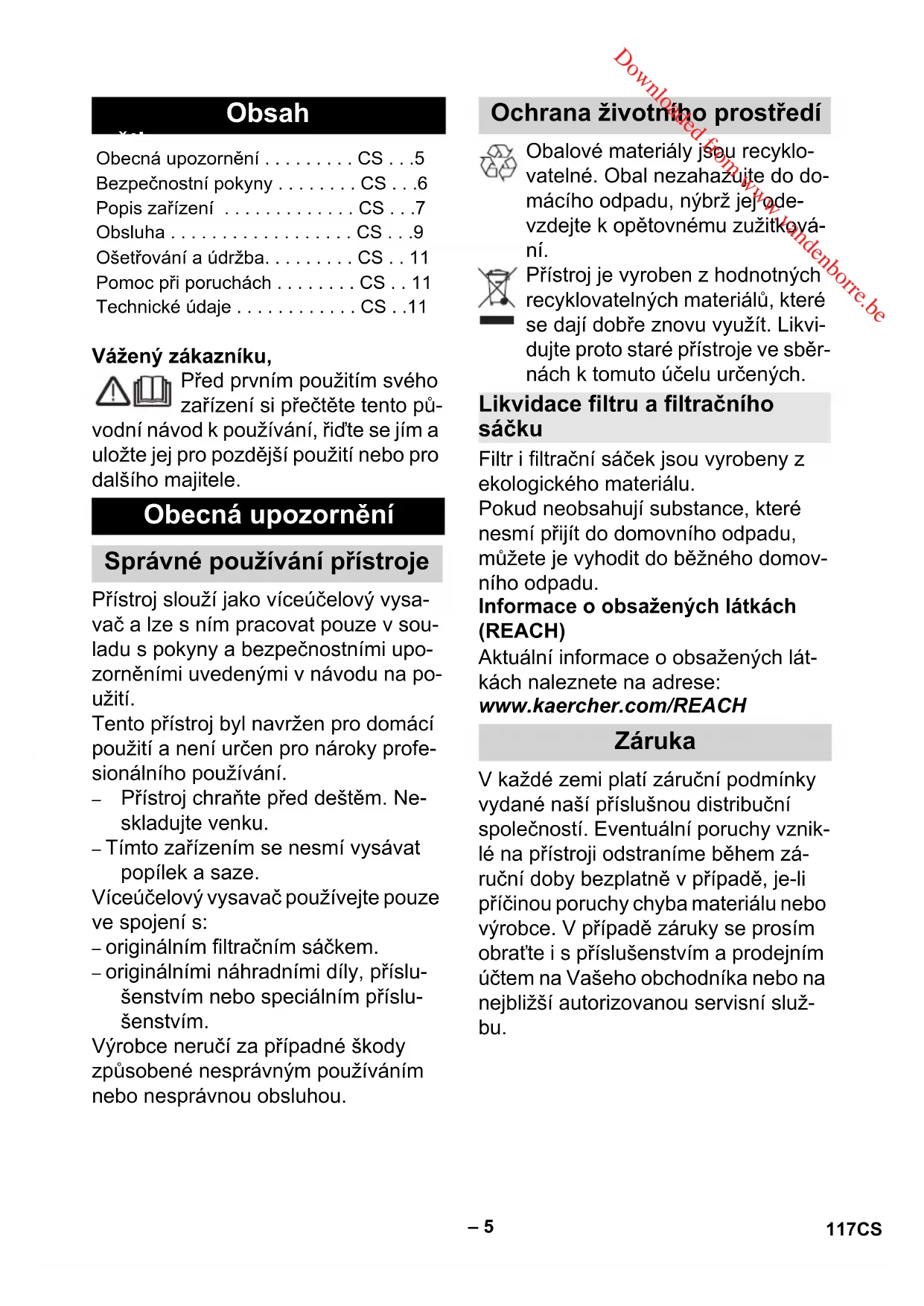 Kapcsolja ki a készüléket és húzza ki a hálózati csatlakozó dugót. Ábra Vegye le a készülékfejet, és ürítse ki a tartályt. Ábra A hálózati csatlakozóvezetéket és a tartozékokat tárolja a készüléken. A készüléket száraz helyiségben kell tárolni. Balesetveszély Minden ápolási- és karbantartá- si munka megkezdése előtt kap- csolja ki a készüléket és húzza ki a hálózati csatlakozót. Elektromos alkatrészeken törté- nő javításokat és munkákat csak jóváhagyott szerviz szolgálat végezhet el. 몇 Figyelem! Ne használjon súrolószert, üve- get vagy univerzális tisztító- szert! A készüléket tilos vízbe meríteni. A műanyagból készült készüléket és tartozékrészeket a kereskede- lemben kapható műanyagtisztítóval kell ápolni. A tartályt és a tartozékokat szükség esetén vízzel öblítse ki és a további használat előtt szárítsa meg. Ábra A patronszűrőt szükség esetén fo- lyóvíz alatt tisztítsa; ne dörzsölje vagy kefélje le. Behelyezés előtt hagyja teljesen megszáradni. Ha a készülék szívóteljesítménye alábbhagy, akkor kérem ellenőrizze a következő pontokat. Tartozékok, szívótömlő vagy szívó- cső el van záródva, az elzáródást egy pálcával távolítsa el. Ábra A porzsák megtelt, helyezzen be új porzsákot. Ábra A patronszűrő szennyeződött, ko- pogtassa le a patronszűrőt, és amennyiben szükséges folyóvíz alatt tisztítsa ki. Cserélje ki a megrongálódott pat- ronszűrőt. A műszaki adatok a IV. oldalon találha- tók, az ott használt szimbólumok ma- gyarázata után. A műszaki adatok módosításának jogát fenntartjuk! Az üzemeltetés befejezése A tartályt ürítse ki A készülék tárolása Ápolás és karbantartás Segítség üzemzavar esetén Csökkenő szívóteljesítmény Műszaki adatok Feszültség Teljesítmény P névl A készülék dugalj max. csat- lakozási teljesítménye Hálózati biztosító (lomha) Tartály térfogata Vízfelvétel fogantyúval Vízfelvétel padlófejjel Hálózati kábel Hangnyomás szint (EN 60704-2-1) Tartozékok nélküli súly 116 HU Downloaded from www.vandenborre.beeština – 5 Vážený zákazníku, Před prvním použitím svého zařízení si přečtěte tento pů- vodní návod k používání, řiďte se jím a uložte jej pro pozdější použití nebo pro dalšího majitele. Přístroj slouží jako víceúčelový vysa- vač a lze s ním pracovat pouze v sou- ladu s pokyny a bezpečnostními upo- zorněními uvedenými v návodu na po- užití. Tento přístroj byl navržen pro domácí použití a není určen pro nároky profe- sionálního používání. – Přístroj chraňte před deštěm. Ne- skladujte venku. – Tímto zařízením se nesmí vysávat popílek a saze. Víceúčelový vysavač používejte pouze ve spojení s: – originálním filtračním sáčkem.– originálními náhradními díly, příslu- šenstvím nebo speciálním příslu- šenstvím. Výrobce neručí za případné škody způsobené nesprávným používáním nebo nesprávnou obsluhou. Obalové materiály jsou recyklo- vatelné. Obal nezahazujte do do- mácího odpadu, nýbrž jej ode- vzdejte k opětovnému zužitková- ní. Přístroj je vyroben z hodnotných recyklovatelných materiálů, které se dají dobře znovu využít. Likvi- dujte proto staré přístroje ve sběr- nách k tomuto účelu určených. Filtr i filtrační sáček jsou vyrobeny z ekologického materiálu. Pokud neobsahují substance, které nesmí přijít do domovního odpadu, můžete je vyhodit do běžného domov- ního odpadu. Informace o obsažených látkách (REACH) Aktuální informace o obsažených lát- kách naleznete na adrese: www.kaercher.com/REACH V každé zemi platí záruční podmínky vydané naší příslušnou distribuční společností. Eventuální poruchy vznik- lé na přístroji odstraníme během zá- ruční doby bezplatně v případě, je-li příčinou poruchy chyba materiálu nebo výrobce. V případě záruky se prosím obraťte i s příslušenstvím a prodejním účtem na Vašeho obchodníka nebo na nejbližší autorizovanou servisní služ- bu. Obsah Obecná upozornění . . . . . . . . . CS . . .5Bezpečnostní pokyny . . . . . . . . CS . . .6Popis zařízení . . . . . . . . . . . . . CS . . .7Obsluha . . . . . . . . . . . . . . . . . . CS . . .9Ošetřování a údržba. . . . . . . . . CS . . 11Pomoc při poruchách . . . . . . . . CS . . 11Technické údaje . . . . . . . . . . . . CS . .11 Obecná upozornění Správné používání přístroje Ochrana životního prostředí Likvidace filtru a filtračního sáčku Záruka 117CS Downloaded from www.vandenborre.be– 6 Budete-li mít otázky nebo v případě poruchy Vám naše zastoupení KÄRCHER rádo pomůže. Výběr nejčastěji vyžadovaných ná- hradních díků najdete na konci návodu k obsluze. Náhradní díly a příslušenství dostane- te u Vašeho prodejce nebo na pobočce KÄRCHER. – Toto zařízení není určeno k tomu, aby je používaly osoby s omezenými fyzickými, smyslovými nebo duševními schopnostmi nebo osoby zcela bez zkušeností a/nebo znalostí, ledaže by tak činily pod dohledem osoby pověře- né zajištěním jejich bezpeč- nosti nebo poté, co od ní ob- držely instruktáž, jak se zaří- zením zacházet a uvědomují si nebezpečích, která s pou- žíváním přístroje souvisí. – Děti smí přístroj používat pouze tehdy, pokud jsou star- ší 8 let a pokud na jejich bez- pečnost dohlíží příslušná osoba nebo pokud o ní získali pokyny, jak se přístroj použí- vá a uvědomují si nebezpe- čím, která s používáním pří- stroje souvisí. – Není dovoleno, aby si děti s přístrojem hrály. – Na děti je třeba dohlížet, aby bylo zajištěno, že si se zaříze- ním nebudou hrát. – Čištění a údržbu přístroje ne- smí provádět děti 