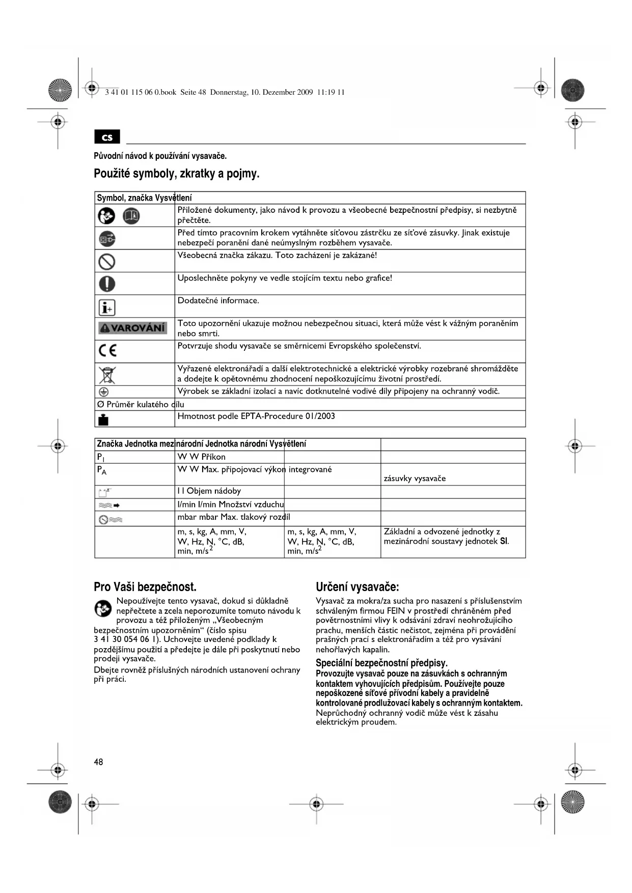Záruka a ruãení. Záruka na výrobek platí podle zákonných ustanovení země uvedení do provozu. Nad to navíc poskytuje firma FEIN záruku podle prohlášení o záruce výrobce FEIN. V obsahu dodávky Vašeho vysavače může být i jen část příslušenství popsaného nebo zobrazeného v tomto návodu k provozu. Prohlá‰ení o shodû. Firma FEIN prohlašuje ve výhradní zodpovědnosti, že tento výrobek odpovídá dotyčným ustanovením uvedeným na poslední straně tohoto návodu k provozu. Ochrana Ïivotního prostfiedí, likvidace. Obaly, vyřazené vysavače a příslušenství dodejte k opětovnému zhodnocení nepoškozujícímu životní prostředí. 3 41 01 115 06 0.book Seite 50 Donnerstag, 10. Dezember 2009 11:19 1151