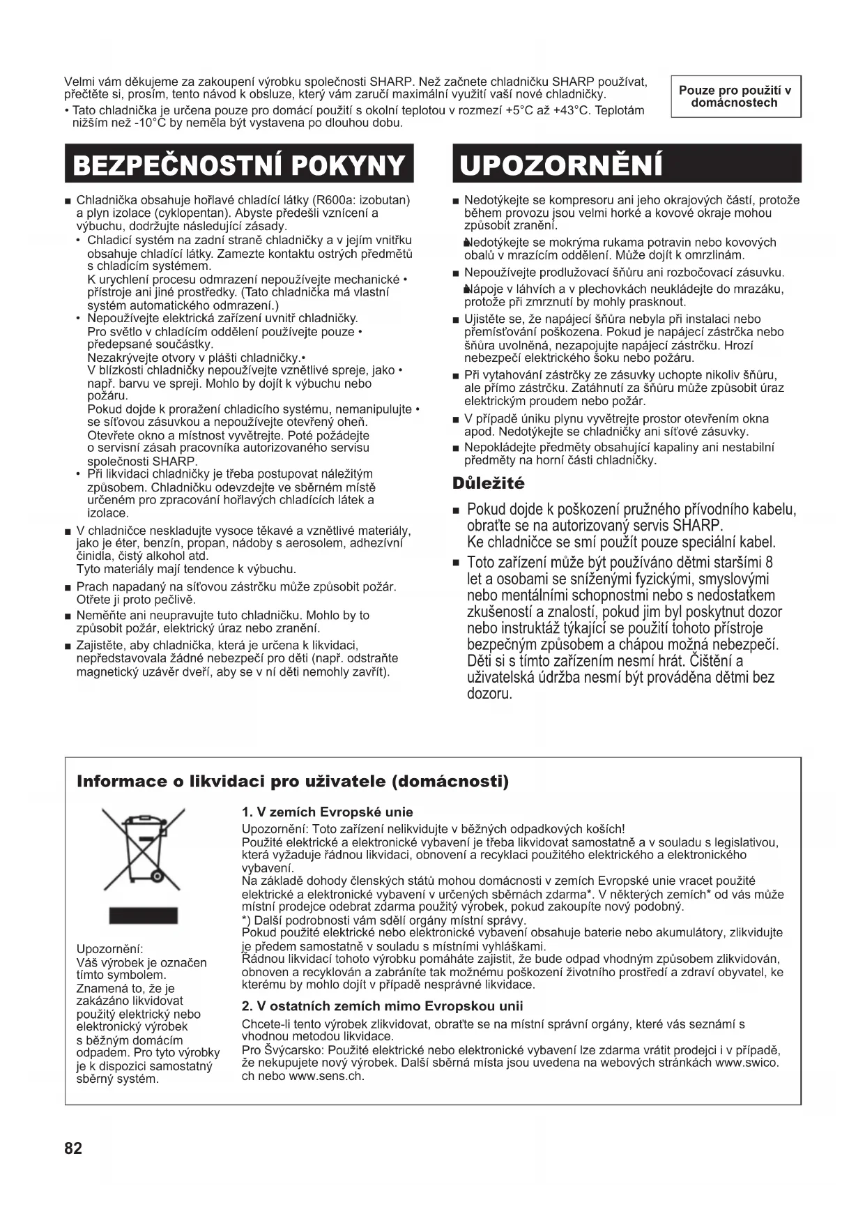 Velmi vám děkujeme za zakoupení výrobku společnosti SHARP. Než začnete chladničku SHARP používat,