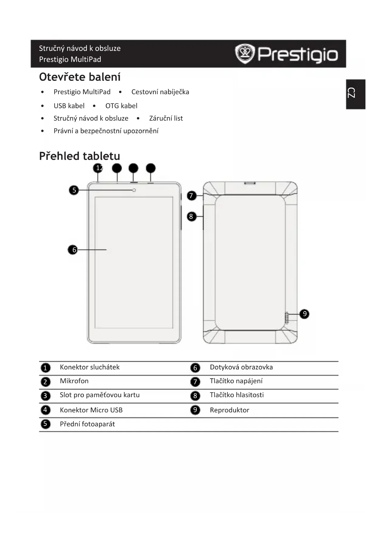 PřednífotoaparátCZ Stručný návod k obsluze Prestigio MultiPad Tlačítka Tlačítko Definice Funkce Napájení