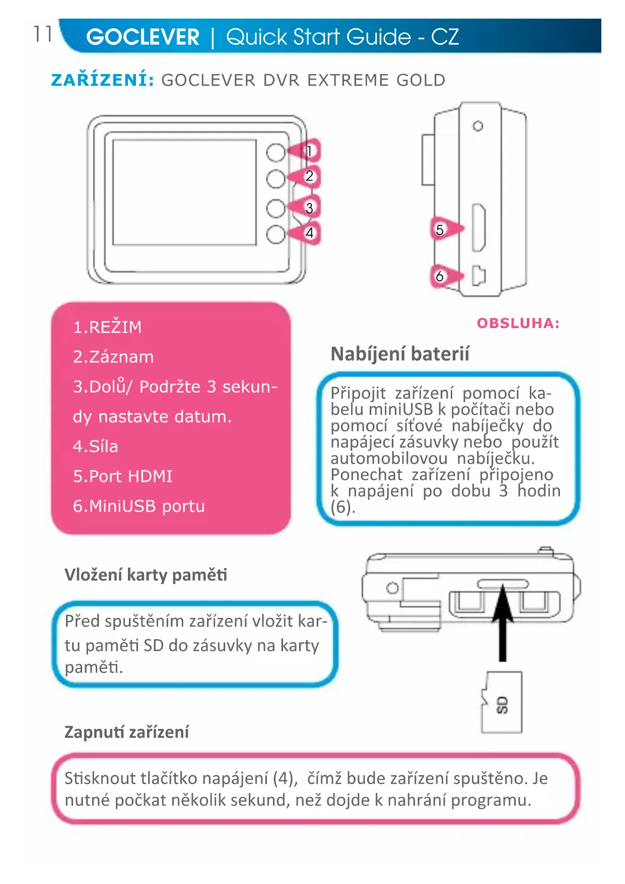 Nabíjení baterií Připojit zařízení pomocí ka- belu miniUSB k počítači nebo pomocí síťové nabíječky do napájecí zásuvky nebo použít automobilovou nabíječku. Ponechat zařízení připojeno k napájení po dobu 3 hodin (6). ObSLuhA: Vložení karty pamě Před spuštěním zařízení vložit kar- tu pamě SD do zásuvky na karty pamě. Zapnu zařízení Ssknout tlačítko napájení (4), čímž bude zařízení spuštěno. Je nutné počkat několik sekund, než dojde k nahrání programu.