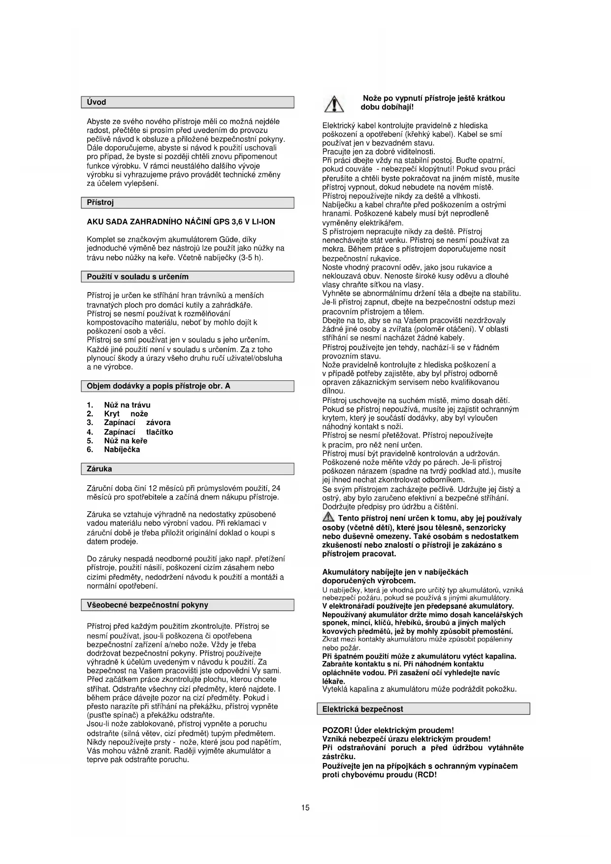 Recyklační alternativa k vyvolání odeslání zpět: Vlastník elektrického přístroje je povinen alternativně místo odeslání zpět spolupůsobit při odborném zhodnocení v případě vlastnictví. Starý přístroj lze také přenechat odběrnému místu, které provede likvidaci ve smyslu národního zákona o oběhovém hospodářství a odpadech. Netýká se to částí příslušenství a pomůcek, které jsou připojeny ke starým přístrojům a neobsahují elektrické součástky. 16Požadavky na obsluhu Obsluha si musí před použitím přístroje pozorně přečíst návod k obsluze a pochopit jej. Kvalifikace: Kromě podrobného poučení odborníkem není pro používání přístroje nutná žádná speciální kvalifikace. Minimální věk: Na přístroji smí pracovat jen osoby, jež dosáhly 16 let. Výjimku představuje využití mladistvých, pokud se toto děje během profesního vzdělávání za účelem dosažení dovednosti pod dohledem školitele. Školení: Používání přístroje vyžaduje pouze odpovídající poučení odborníkem resp. návodem k obsluze. Speciální školení není nutné. Technické údaje Akumulátor: 3,6 V / 1,3 Ah ( Li-Ion ) Nabíječka: 3-5 h Šířka záběru nůžek na trávu: 80 mm Délka záběru nůžek na živý plot: 115 mm / max. průměr 8 mm Provozní doba akumulátoru: cca 50 min. Hlučnost: L