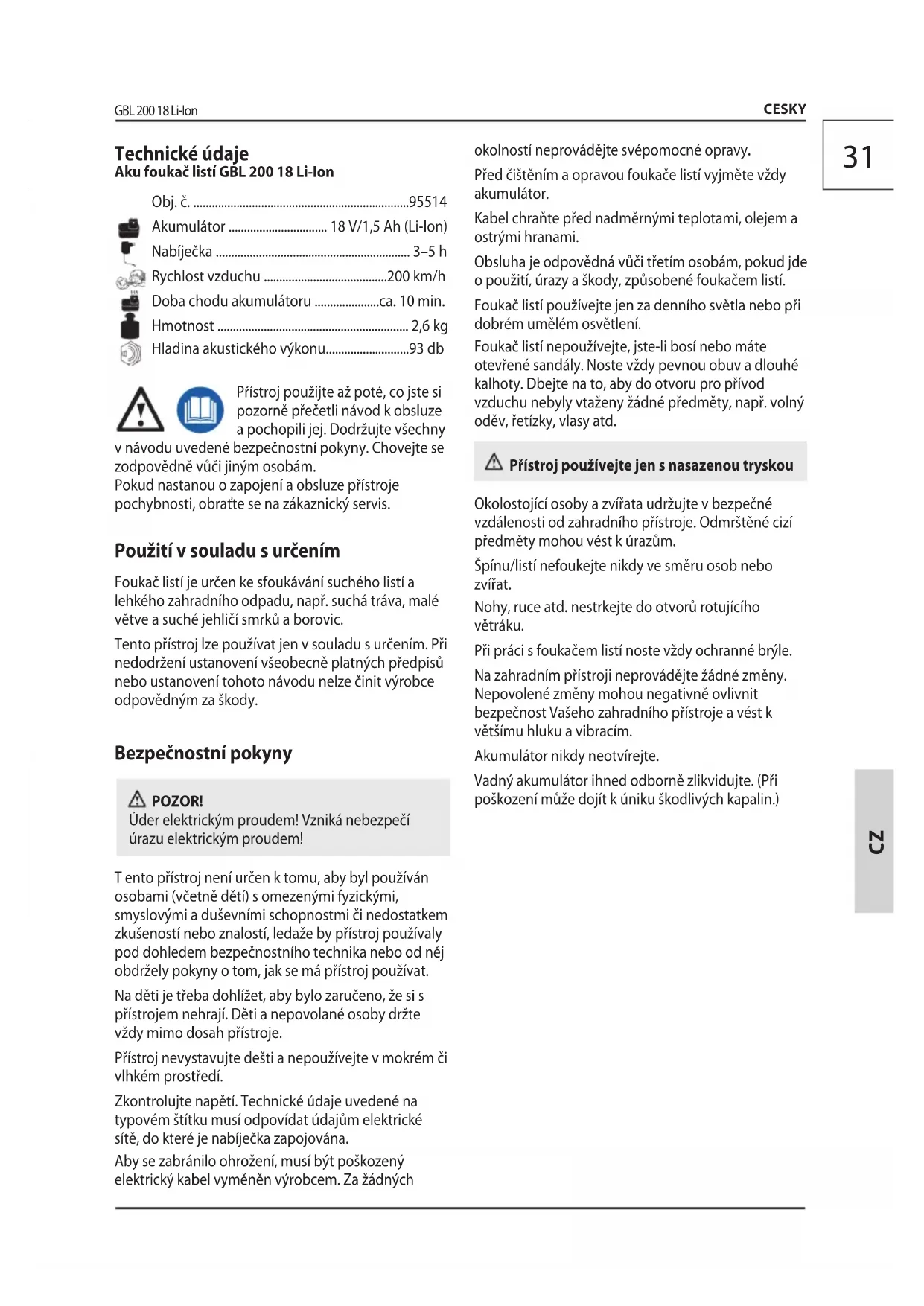 ento přístroj není určen k tomu, aby byl používán osobami (včetně dětí) s omezenými fyzickými, smyslovými a duševními schopnostmi či nedostatkem zkušeností nebo znalostí, ledaže by přístroj používaly pod dohledem bezpečnostního technika nebo od něj obdržely pokyny o tom, jak se má přístroj používat. Na děti je třeba dohlížet, aby bylo zaručeno, že si s přístrojem nehrají. Děti a nepovolané osoby držte vždy mimo dosah přístroje. Přístroj nevystavujte dešti a nepoužívejte v mokrém či vlhkém prostředí. Zkontrolujte napětí. Technické údaje uvedené na typovém štítku musí odpovídat údajům elektrické sítě, do které je nabíječka zapojována. Aby se zabránilo ohrožení, musí být poškozený elektrický kabel vyměněn výrobcem. Za žádných okolností neprovádějte svépomocné opravy. Před čištěním a opravou foukače listí vyjměte vždy akumulátor. Kabel chraňte před nadměrnými teplotami, olejem a ostrými hranami. Obsluha je odpovědná vůči třetím osobám, pokud jde o použití, úrazy a škody, způsobené foukačem listí. Foukač listí používejte jen za denního světla nebo při dobrém umělém osvětlení. Foukač listí nepoužívejte, jste-li bosí nebo máte otevřené sandály. Noste vždy pevnou obuv a dlouhé kalhoty. Dbejte na to, aby do otvoru pro přívod vzduchu nebyly vtaženy žádné předměty, např. volný oděv, řetízky, vlasy atd. Přístroj používejte jen s nasazenou tryskou Okolostojící osoby a zvířata udržujte v bezpečné vzdálenosti od zahradního přístroje. Odmrštěné cizí předměty mohou vést k úrazům. Špínu/listí nefoukejte nikdy ve směru osob nebo zvířat. Nohy, ruce atd. nestrkejte do otvorů rotujícího větráku. Při práci s foukačem listí noste vždy ochranné brýle. Na zahradním přístroji neprovádějte žádné změny. Nepovolené změny mohou negativně ovlivnit bezpečnost Vašeho zahradního přístroje a vést k většímu hluku a vibracím. Akumulátor nikdy neotvírejte. Vadný akumulátor ihned odborně zlikvidujte. (Při poškození může dojít k úniku škodlivých kapalin.) Technické údaje Aku foukač listí GBL 200 18 Li-Ion Obj. č. ......................................................................95514 Akumulátor ................................ 18 V/1,5 Ah (Li-Ion) Nabíječka ............................................................... 3–5 h Rychlost vzduchu ........................................200 km/h Doba chodu akumulátoru .....................ca. 10 min. Hmotnost .............................................................. 2,6 kg Hladina akustického výkonu...........................93 db32 GBL 200 18 Li-Ion CESKY