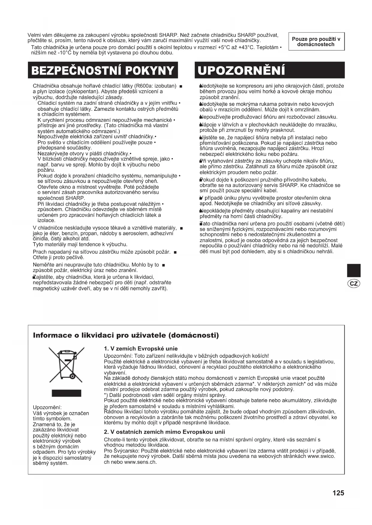 Velmi vám děkujeme za zakoupení výrobku společnosti SHARP. Než začnete chladničku SHARP používat,