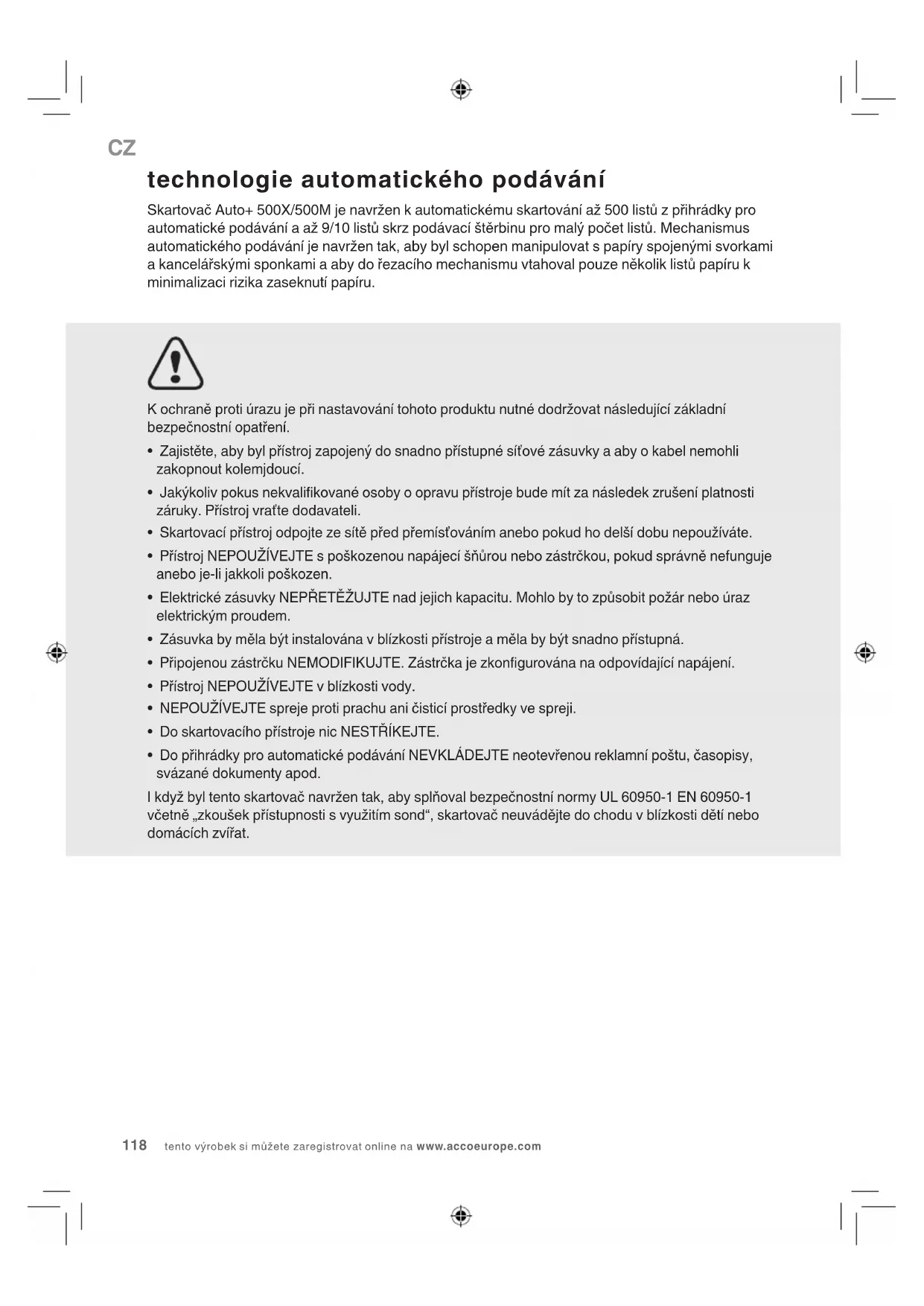 - je skartovací přístroj v nečinnosti 30 minut (ale dokumenty zůstávají v přihrádce pro automatické podávání)124 tento výrobek si můžete zaregistrovat online na www.accoeurope.com