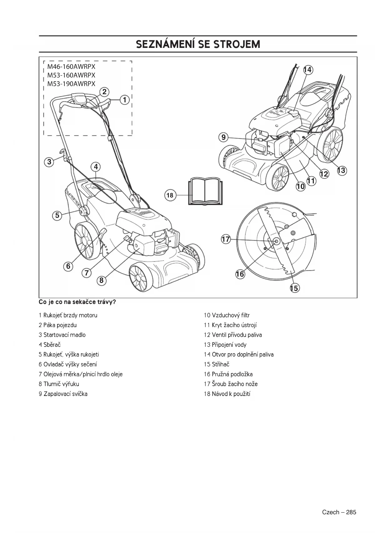 1 RukojeÈ brzdy motoru 2 Páka pojezdu 3 Startovací madlo 4 Sbûraã 5 RukojeÈ, v˘‰ka rukojeti 6 Ovladaã v˘‰ky seãení 7 Olejová mûrka/plnicí hrdlo oleje 8 Tlumiã v˘fuku 9 Zapalovací svíãka 10 Vzduchov˘ filtr 11 Kryt Ïacího ústrojí 12 Ventil pfiívodu paliva 13 Pfiipojení vody 14 Otvor pro doplnûní paliva 15 Stfiihaã 16 PruÏná podloÏka 17 ·roub Ïacího noÏe 18 Návod k pouÏitíBEZPEâNOSTNÍ V¯BAVA ZA¤ÍZENÍ 286 – Czech V‰eobecnû Tato ãást popisuje bezpeãnostní vybavení stroje, jeho úãel a zpÛsob, kter˘m by se mûla provádût kontrola a údrÏba, aby byla zaji‰tûna jeho správná funkce. Kryt Ïacího ústrojí