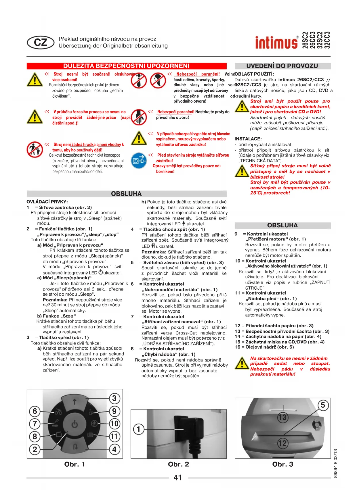 OBSLUHA Obr.1 Obr.4 Překlad originálního návodu na provozÜbersetzung der Originalbetriebsanleitung- Zbylý materiál je nyní automaticky znova zaveden do stříhacího zařízení a je skartován. - Kontrolka (6) zhasne. LED-ukazatel tlačítka vpřed (3) svítí trvale.- Když stříhaný materiál proběhl stříhacím zařízením, lze pokračovat ve skartování se správným dávkováním. - Pokud je to nutné, přepínat manuálně stříhací zařízení střídavě vpřed a zpět tak dlouho, až celý skartovaný materiál proběhne a skartuje se.Při každém přepnutí směru pohybu počkat, až se motor zastaví!OCHRANAMOTORU:Pokud je motor přetěžován, tak se vypne. Kontrolka (9) bliká. Vypněte přístroj pomocí kolébkového vypínače (1). Po ochlazení trvajícím asi 25-40 minut (podle modelu a teploty prostoru) můžete přístroj opět spustit.NAHROMADĚNÍMATERIÁLUVPŘÍSTROJI:(funkceauto-reverse)Pokud se v přístroji nahromadí příliš mnoho materiálu, reaguje stroj následovně:- Stříhací zařízení se zastaví, pak běží kousek zpět (materiál se uvolní) a zastaví se. Motor se vypne.- Rozsvítí se kontrolka (6).Postupujte následovně:Nahromaděnípapíruvpřívodníšachtěnapapír(12)- Papír vyvedený zpět z přívodní šachty (12) odebrat.- Stříhací zařízení nyní běží automaticky vpřed a skartuje zbytky papíru, které zůstaly ve stříhacím zařízení. - Kontrolka (6) zhasne. LED-ukazatel tlačítka vpřed (3) svítí trvale.- Pokračovat se skartací menšího množství papíru. Nahromadění materiálu v bezpečnostní přívodníšachtě(13)- Odebrat zpět vyvedený materiál.Materiál odebírat opatrně, protože hrozí nebezpečí pořezání ostrými hranami rozstříhaných míst!KONTROLNÍSEZNAMPŘIPORUCHÁCH:Pokud přístroj nefunguje, zkontrolujte následující body:- je síťovázástrčkapřipojena k síti?- je přístroj v „módusleep(spánek)“? Viz pod „ENERGETICKY ÚSPORNÁ AUTOMATIKA“.- je aktivováno blokováníuživatele? Viz pod „POUŽITÍ BLOKOVÁNÍ UŽIVATELE“.- je zasunuta záchytnánádoba?- je záchytnánádoba plná? Postupujte podle instrukcí u „VYPRÁZDNĚNÍ ZÁCHYTNÉ NÁDOBY“.- došlo v přístroji k nahromaděnímateriálu? Postupujte podle instrukcí u „NAHROMADĚNÍ MATERIÁLU V PŘÍSTROJI“.- je motor přetížen? Viz pod „OCHRANA MOTORU“. Pokud se nejedná o žádný z výše uvedených kontrolních bodů, informujte prosím Vašeho prodejce. 26SC2 26CC3 32SC2 32CC3