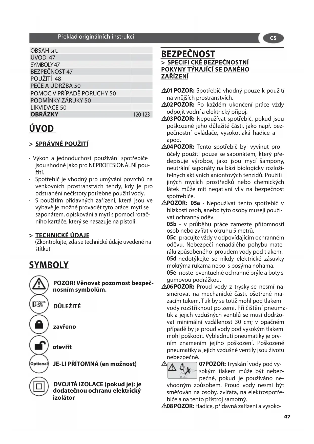 S použitím přídavných zařízení, která jsou ve výbavě je možné provádět tyto práce: mytí se saponátem, opískování a mytí s pomocí rotač- ního kartáče, který se nasazuje na pistoli. > TECHNICKÉ ÚDAJE (Zkontrolujte, zda se technické údaje uvedené na štítku) SYMBOLY POZOR! Věnovat pozornost bezpeč- nosním symbolům.