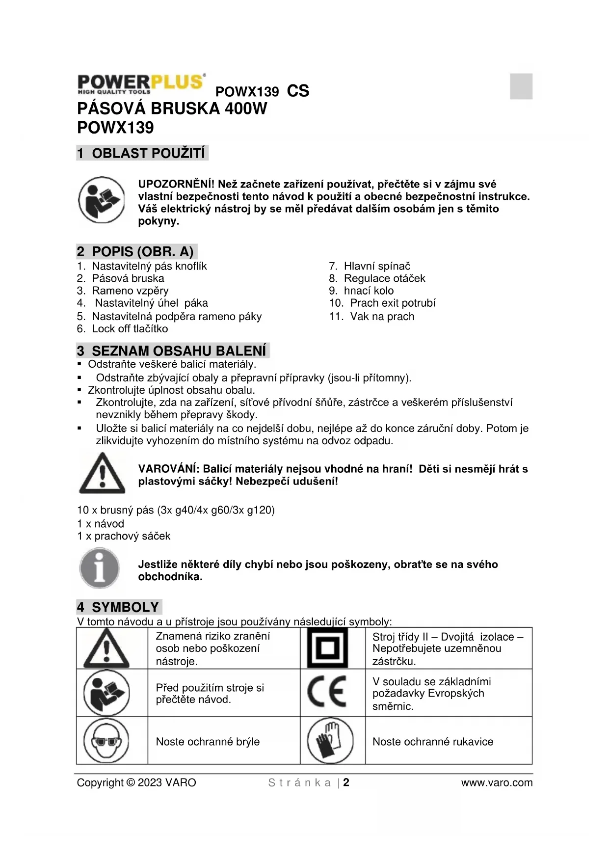 Stáhněte si návod pro váš Bruska ve formátu PDF zdarma! Najděte svůj návod POWX139 - PowerPlus a vezměte svůj elektronický přístroj zpět do rukou. Na této stránce jsou zveřejněny všechny dokumenty potřebné k používání vašeho zařízení. POWX139 značky PowerPlus.