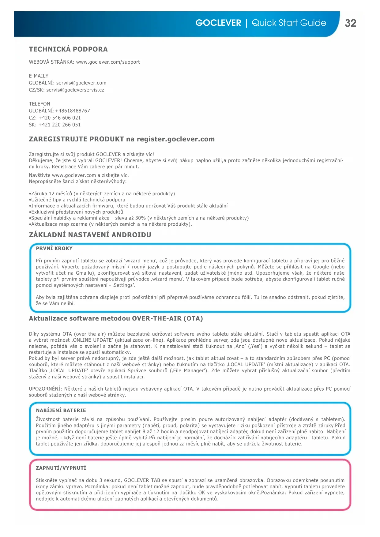 PRVNÍ KROKY Při prvním zapnutí tabletu se zobrazí ‘wizard menu’, což je průvodce, který vás provede konfigurací tabletu a připraví jej pro běžné používání. Vyberte požadovaný místní / rodný jazyk a postupujte podle následných pokynů. Můžete se přihlásit na Google (nebo vytvořit účet na Gmailu), zkonfigurovat svá síťová nastavení, zadat uživatelské jméno atd. Upozorňujeme však, že některé naše tablety při prvním spuštění nepoužívají průvodce ‚wizard menu’. V takovém případě bude potřeba, abyste zkonfigurovali tablet ručně pomocí systémových nastavení - ‚Settings’. Aby byla zajištěna ochrana displeje proti poškrábání při přepravě používáme ochrannou fólií. Tu lze snadno odstranit, pokud zjistíte, že se Vám nelíbí. ZAREGISTRUJTE PRODUKT na register.goclever.com Zaregistrujte si svůj produkt GOCLEVER a získejte víc! Děkujeme, že jste si vybrali GOCLEVER! Chceme, abyste si svůj nákup naplno užili,a proto začněte několika jednoduchými registrační- mi kroky. Registrace Vám zabere jen pár minut. Navštivte www.goclever.com a získejte víc. Nepropásněte šanci získat některévýhody:
