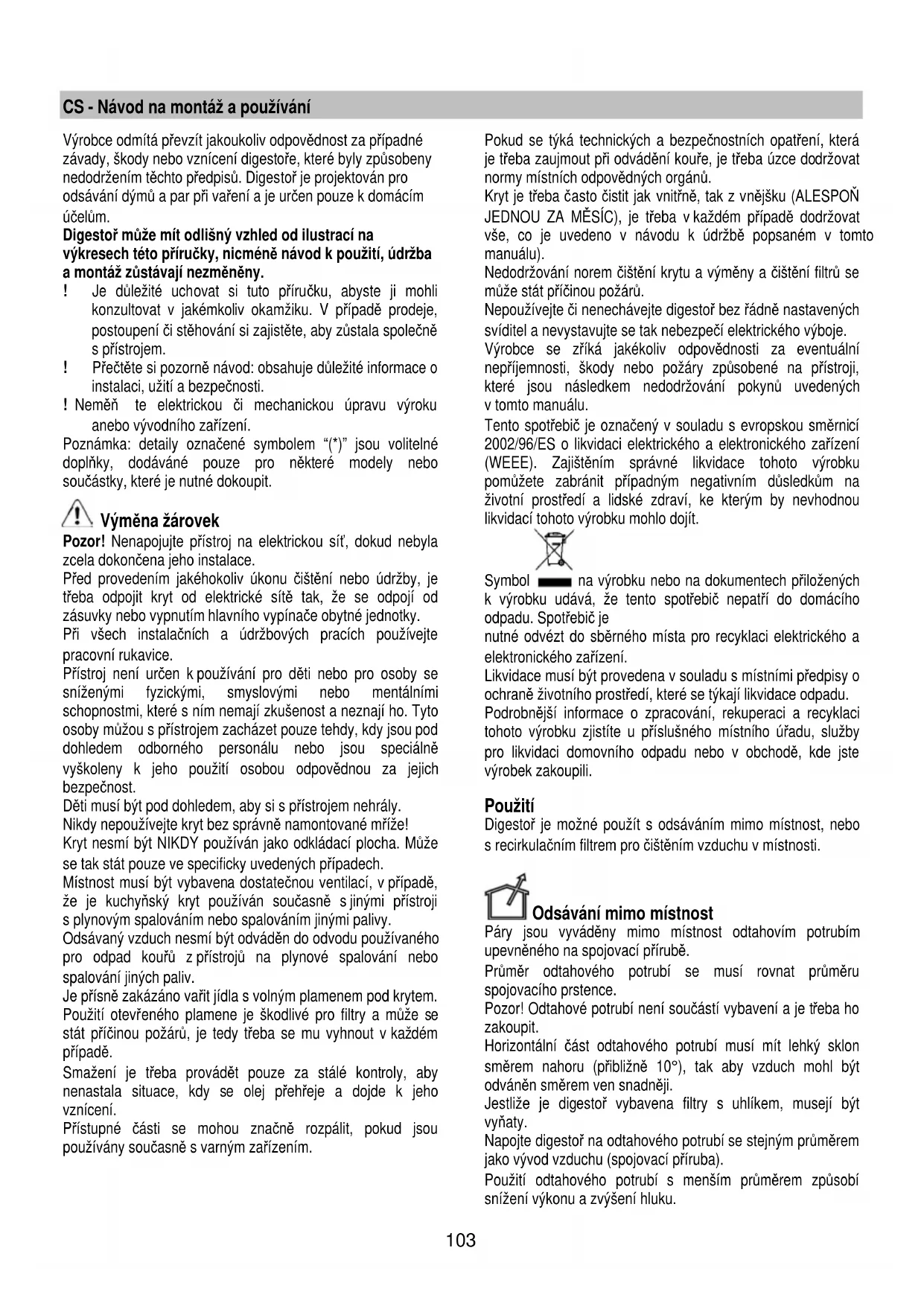 nedodržením těchto předpisů. Digestoř je projektován pro