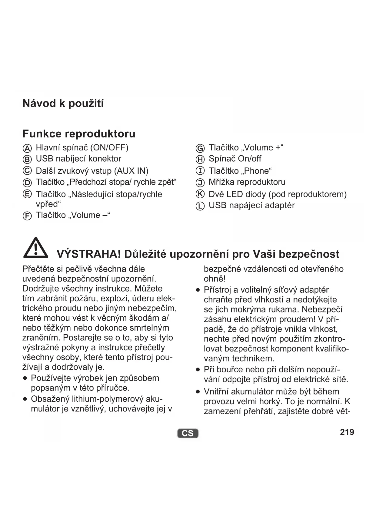 držte On/Off spínač , dokud neusly- šíte zvuk vypnuto. Poznámka: Zařízení, která jsou spá- rovány pomocí Bluetooth, jsou provo- zovány dle podporovaných protokolů. Například smartphony normálně pou- žívají HFP (prol hands-free) a A2DP (prol Advanced Audio Distribution). V tomto případě kontroluje reproduktor jak hovory, tak reprodukci zvuku. S MP3 přehrávačem s A2DP bude fungovat pouze reprodukce zvuku a s jednoduchým mobilním telefonem lze kontrolovat pouze hovory.223