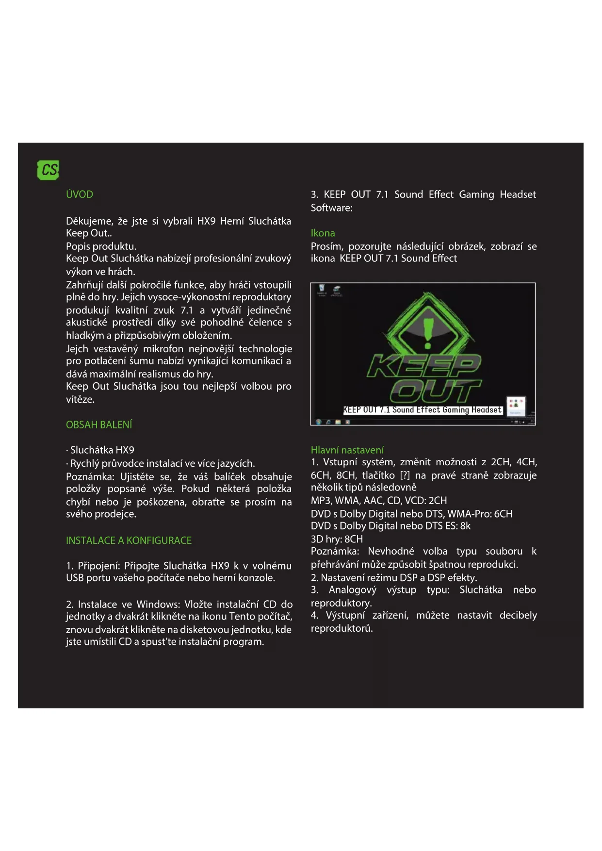 Показва информация за софтуера и ви позволява да показвате или не софтуер иконата на работния плот. KEEPOUT Virtual 7.1 CH Audio Device Ver: 1.0 Copyright © 2013, KEEPOUT URL: www.keep-out.eu ТЕХНИЧЕСКА ПОДДРЪЖКА За повече информация относно инсталирането и конфигурирането на този продукт в нашия сайт www.keepout.eu или напишете имейл на следния адрес: support@keep-out.eu.CS ÚVOD Děkujeme, že jste si vybrali HX9 Herní Sluchátka Keep Out.. Popis produktu. Keep Out Sluchátka nabízejí profesionální zvukový výkon ve hrách. Zahrňují další pokročilé funkce, aby hráči vstoupili plně do hry. Jejich vysoce-výkonostní reproduktory produkují kvalitní zvuk 7.1 a vytváří jedinečné akustické prostředí díky své pohodlné čelence s hladkým a přizpůsobivým obložením. Jejch vestavěný mikrofon nejnovější technologie pro potlačení šumu nabízí vynikající komunikaci a dává maximální realismus do hry. Keep Out Sluchátka jsou tou nejlepší volbou pro vítěze. OBSAH BALENÍ