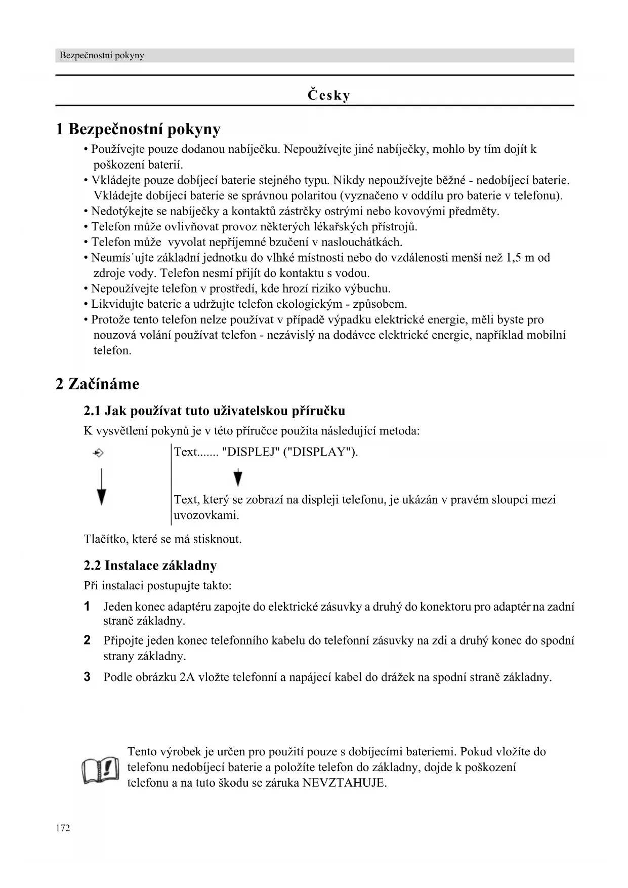 Pi instalaci postupujte takto: 1 Jeden konec adaptéru zapojte do elektrické zásuvky a druhý do konektoru pro adaptér na zadní stran[ základny. 2 Pipojte jeden konec telefonního kabelu do telefonní zásuvky na zdi a druhý konec do spodní strany základny. 3 Podle obrázku 2A vložte telefonní a napájecí kabel do drážek na spodní stran[ základny. Text....... "DISPLEJ" ("DISPLAY"). Text, který se zobrazí na displeji telefonu, je ukázán v pravém sloupci mezi uvozovkami. Tento výrobek je uren pro použití pouze s dobíjecími bateriemi. Pokud vložíte do telefonu nedobíjecí baterie a položíte telefon do základny, dojde k poškození telefonu a na tuto škodu se záruka NEVZTAHUJE.esky