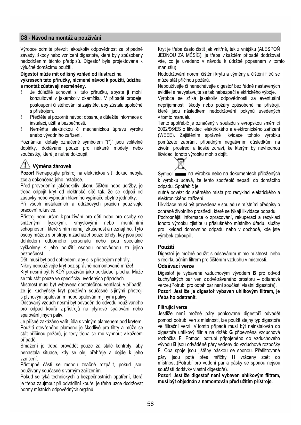 ćete prasak). Ako vam ne bude funkcionirala rasvjeta, kontrolirajte jeste li pravilno stavili lampu prije nego što pozovete tehnički servis56 CS - Návod na montáž a používání Výrobce odmítá převzít jakoukoliv odpovědnost za případné závady, škody nebo vznícení digestoře, které byly způsobeny nedodržením těchto předpisů. Digestoř byla projektována k výlučně domácímu použití. Digestoř může mít odlišný vzhled od ilustrací na výkresech této příručky, nicméně návod k použití, údržba a montáž zůstávají nezměněny. ! Je důležité uchovat si tuto příručku, abyste ji mohli konzultovat v jakémkoliv okamžiku. V případě prodeje, postoupení či stěhování si zajistěte, aby zůstala společně s přístrojem. ! Přečtěte si pozorně návod: obsahuje důležité informace o instalaci, užití a bezpečnosti. ! Neměňte elektrickou či mechanickou úpravu výroku anebo vývodního zařízení. Poznámka: detaily označené symbolem “(*)” jsou volitelné doplňky, dodáváné pouze pro některé modely nebo součástky, které je nutné dokoupit. Výměna žárovek Pozor! Nenapojujte přístroj na elektrickou síť, dokud nebyla zcela dokončena jeho instalace. Před provedením jakéhokoliv úkonu čištění nebo údržby, je třeba odpojit kryt od elektrické sítě tak, že se odpojí od zásuvky nebo vypnutím hlavního vypínače obytné jednotky. Při všech instalačních a údržbových pracích používejte pracovní rukavice. Přístroj není určen k používání pro děti nebo pro osoby se sníženými fyzickými, smyslovými nebo mentálními schopnostmi, které s ním nemají zkušenost a neznají ho. Tyto osoby můžou s přístrojem zacházet pouze tehdy, kdy jsou pod dohledem odborného personálu nebo jsou speciálně vyškoleny k jeho použití osobou odpovědnou za jejich bezpečnost. Děti musí být pod dohledem, aby si s přístrojem nehrály. Nikdy nepoužívejte kryt bez správně namontované mříže! Kryt nesmí být NIKDY používán jako odkládací plocha. Může se tak stát pouze ve specificky uvedených případech. Místnost musí být vybavena dostatečnou ventilací, v případě, že je kuchyňský kryt používán současně s jinými přístroji s plynovým spalováním nebo spalováním jinými palivy. Odsávaný vzduch nesmí být odváděn do odvodu používaného pro odpad kouřů z přístrojů na plynové spalování nebo spalování jiných paliv. Je přísně zakázáno vařit jídla s volným plamenem pod krytem. Použití otevř eného plamene je škodlivé pro filtry a může se stát příčinou požárů, je tedy třeba se mu vyhnout v každém případě. Smažení je třeba provádět pouze za stálé kontroly, aby nenastala situace, kdy se olej přehřeje a dojde k jeho vznícení. Přístupné části se mohou značně rozpálit, pokud jsou používány současně s varným zařízením. Pokud se týká technických a bezpečnostních opatření, která je třeba zaujmout při odvádění kouře, je třeba úzce dodržovat normy místních odpovědných orgánů. Kryt je třeba často čistit jak vnitřně, tak z vnějšku (ALESPOŇ JEDNOU ZA MĚSÍC), je třeba v každém případě dodržovat vše, co je uvedeno v návodu k údržbě popsaném v tomto manuálu). Nedodržování norem čištění krytu a výměny a čiště ní filtrů se může stát příčinou požárů. Nepoužívejte či nenechávejte digestoř bez řádně nastavených svíditel a nevystavujte se tak nebezpečí elektrického výboje. Výrobce se zříká jakékoliv odpovědnosti za eventuální nepříjemnosti, škody nebo požáry způsobené na přístroji, které jsou následkem nedodržování pokynů uvedených v tomto manuálu. Tento spotřebič je označený v souladu s evropskou směrnicí 2002/96/ES o likvidaci elektrického a elektronického zařízení (WEEE). Zajištěním správné likvidace tohoto výrobku pomůžete zabránit případným negativním důsledkům na životní prostředí a lidské zdraví, ke kterým by nevhodnou likvidací tohoto výrobku mohlo dojít. Symbol na výrobku nebo na dokumentech přiložených k výrobku udává, že tento spotřebič nepatří do domácího odpadu. Spotřebič je nutné odvézt do sběrného místa pro recyklaci elektrického a elektronického zařízení. Likvidace musí být provedena v souladu s místními předpisy o ochraně životního prostředí, které se týkají likvidace odpadu. Podrobnější informace o zpracování, rekuperaci a recyklaci tohoto výrobku zjistíte u příslušného místního úřadu, služby pro likvidaci domovního odpadu nebo v obchodě, kde jste výrobek zakoupili. Použití Digestoř je možné použít s odsáváním mimo místnost, nebo s recirkulačním filtrem pro čištěním vzduchu v místnosti. Odsávací verze Digestoř je vybavena vzduchovým vývodem B pro odvod kuchyňských par ven z odvětrávaného prostoru – odtahová verze.(Potrubí pro odtah par není součástí vlastní digestoře). Pozor! Jestliže je digestoř vybaven uhlíkovým filtrem, je třeba ho odstranit. Filtrující verze Jestliže není možné páry pohlcované digestoří odvádět pomocí potrubí ven z místnosti, lze použít stejný typ digestoře ve filtrační verzi. V tomto případě musí být nainstalován do digestoře uhlíkový filtr a na držák G připevněna vzduchová rozbočka F. Pomocí potrubí připojeného do vzduchového vývodu B jsou odváděné páry vedeny do vzduchové rozbočky F. Oba spoje jsou jištěny páskou se sponou. Přefiltrované páry jsou poté přes mřížky H vráceny zpět do místnosti.(Potrubí pro vedení par a pásky se sponou nejsou součástí dodávky vlastní digestoře). Pozor! Jestliže digestoř není vybaven uhlíkovým filtrem, musí být objednán a namontován před užitím přístroje.57 Modely bez sacího motoru jsou dodávány pouze v odtahov