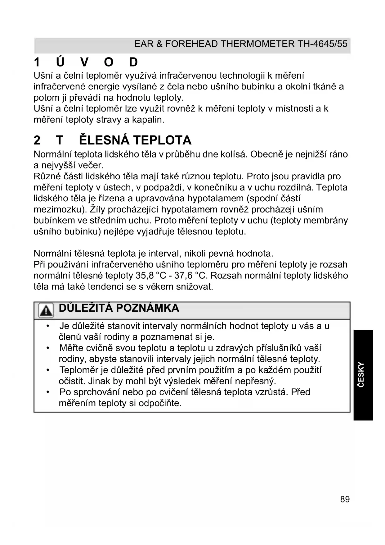 - Po sprchování nebo po cvičení tělesná teplota vzrůstá. Před měřením teploty si odpočiňte. HL_Ear & Forehead Thermometer 301 D106.book Page 89 Thursday, January 17, 2013 10:49 AM90